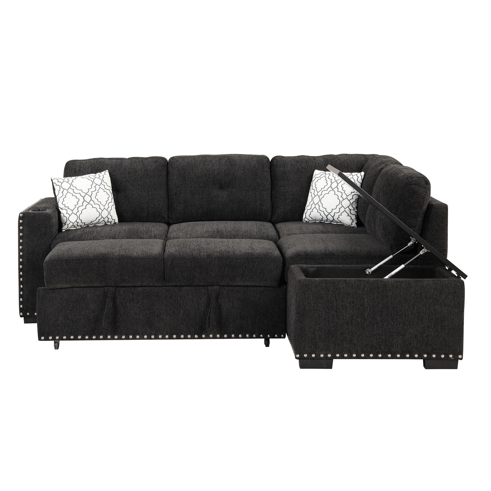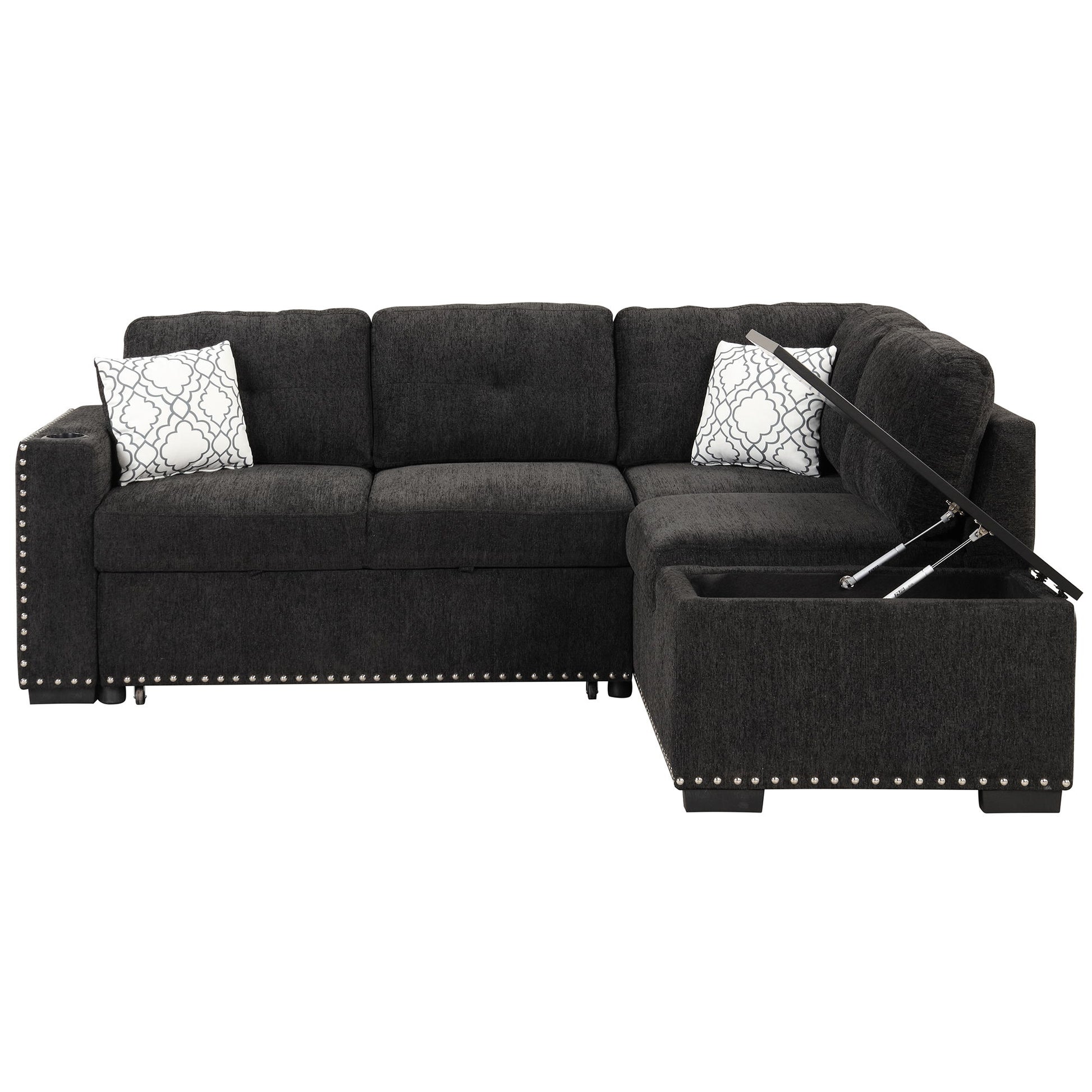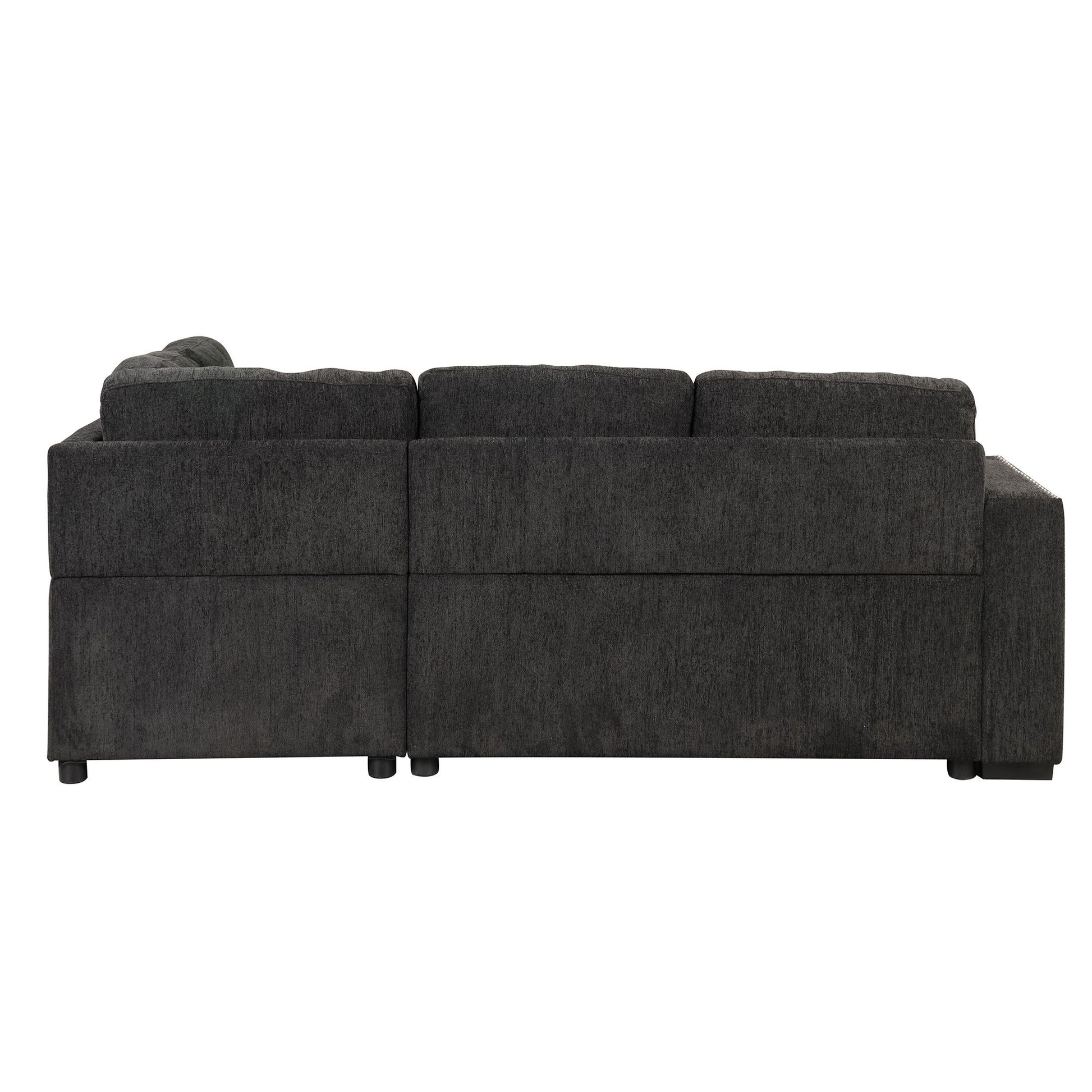 Sectional Pull-Out Sofa Bed L-Shaped Corner Sofa Couch With Storage Chaise, USB Ports, Power Sockets, Cup Holder For Living Room, Bedroom, Study - Black