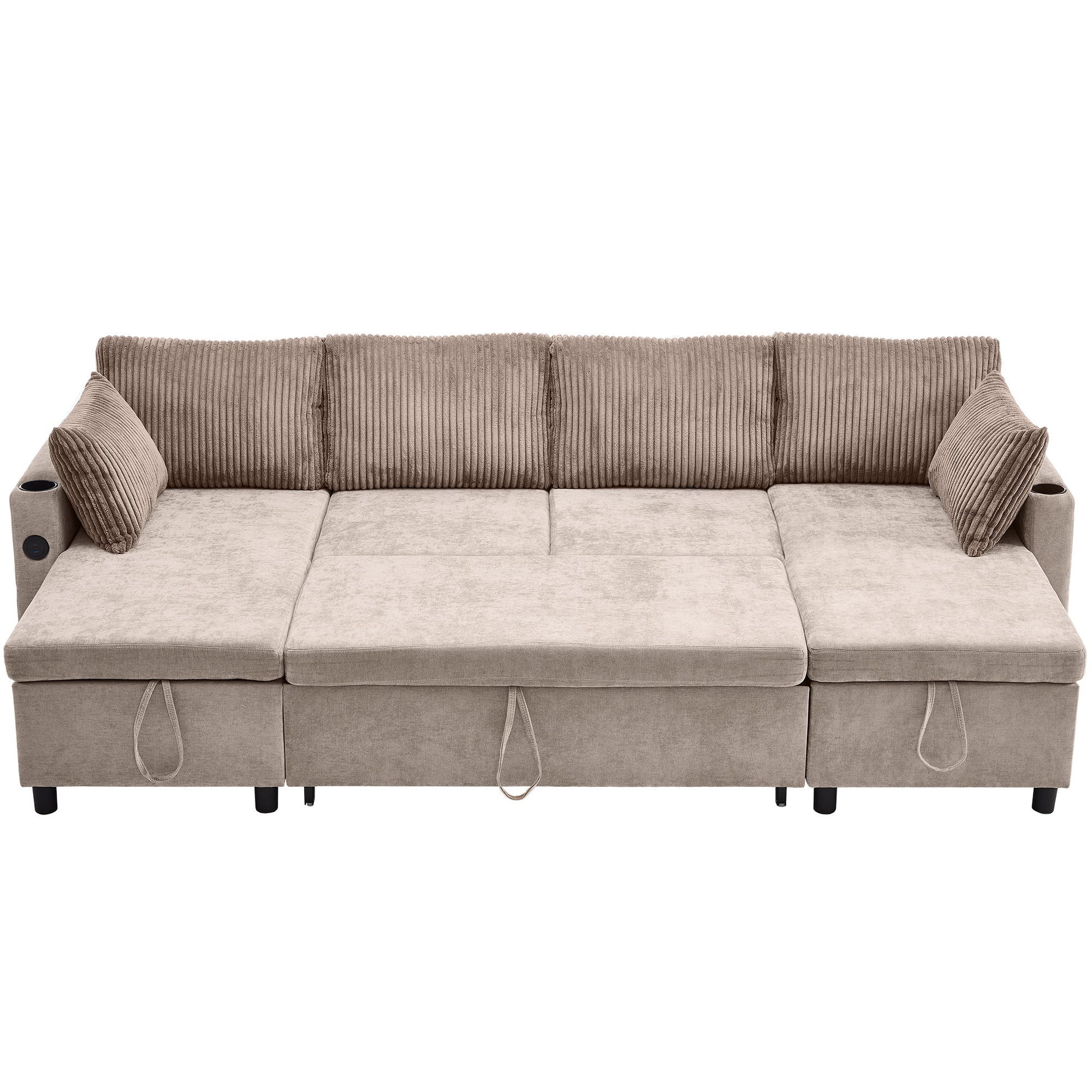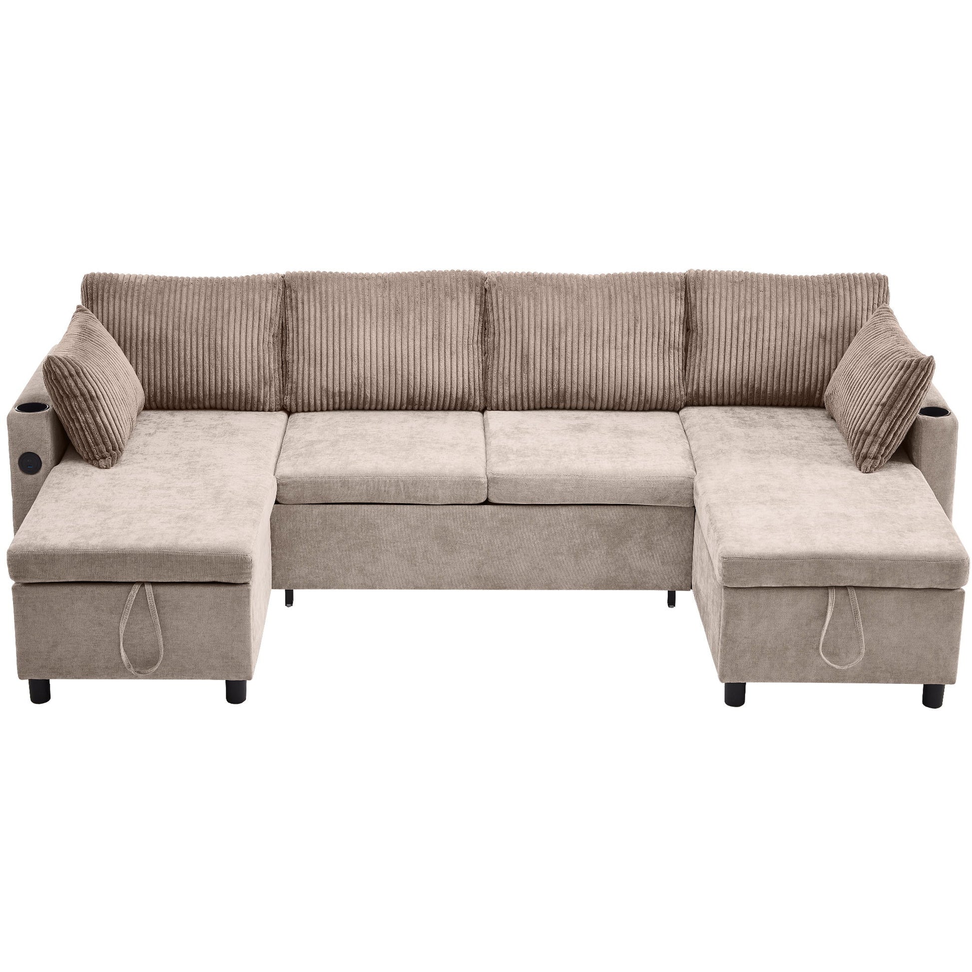 Sectional Sofa Bed With Pull Out Sleeper, Storage Chaise Lounges, USB Ports, Cup Holders - Beige