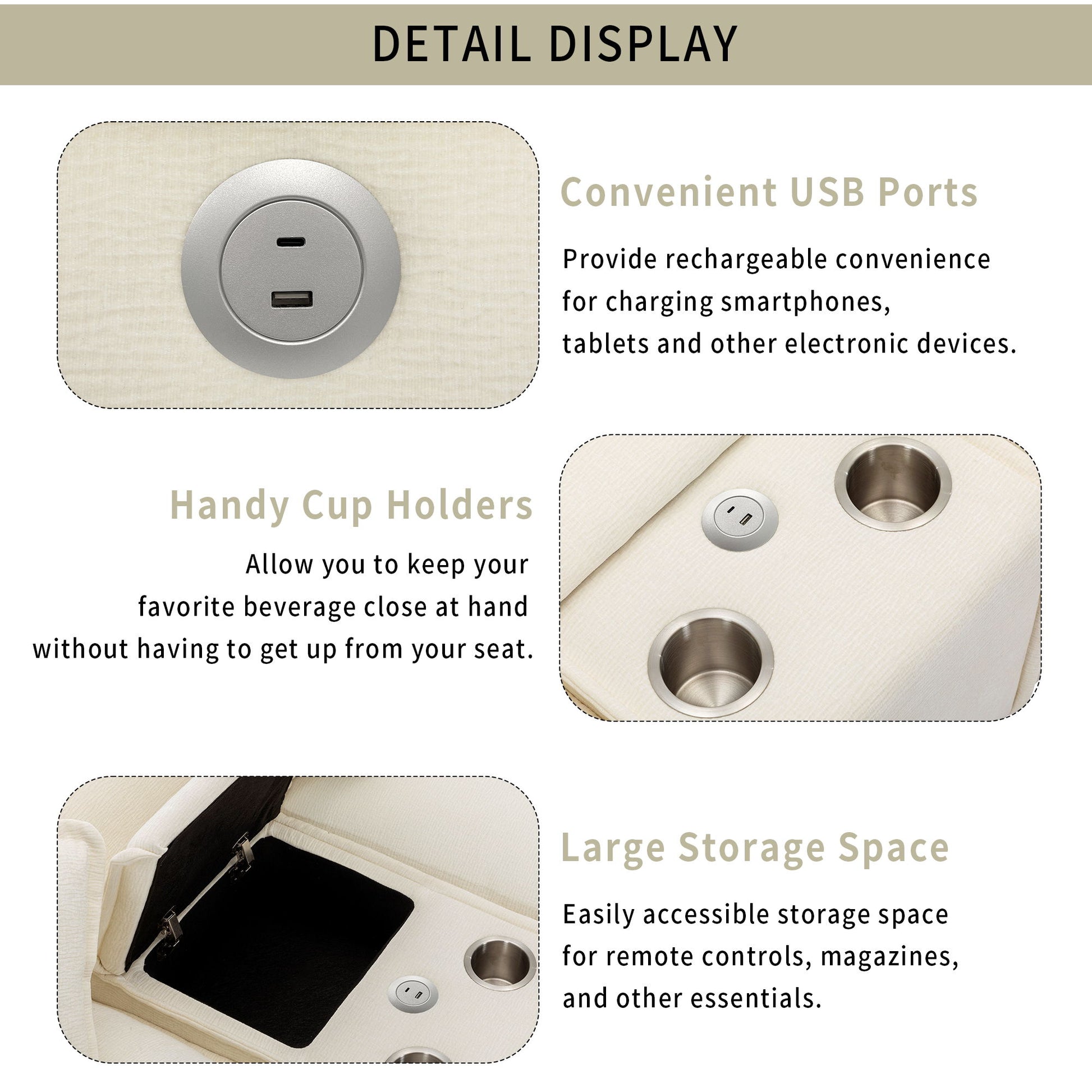 - Modern Functionality with USB Ports and Cup Holders: Stay connected with USB charging ports while keeping your favorite drinks close by with two integrated cup holders.