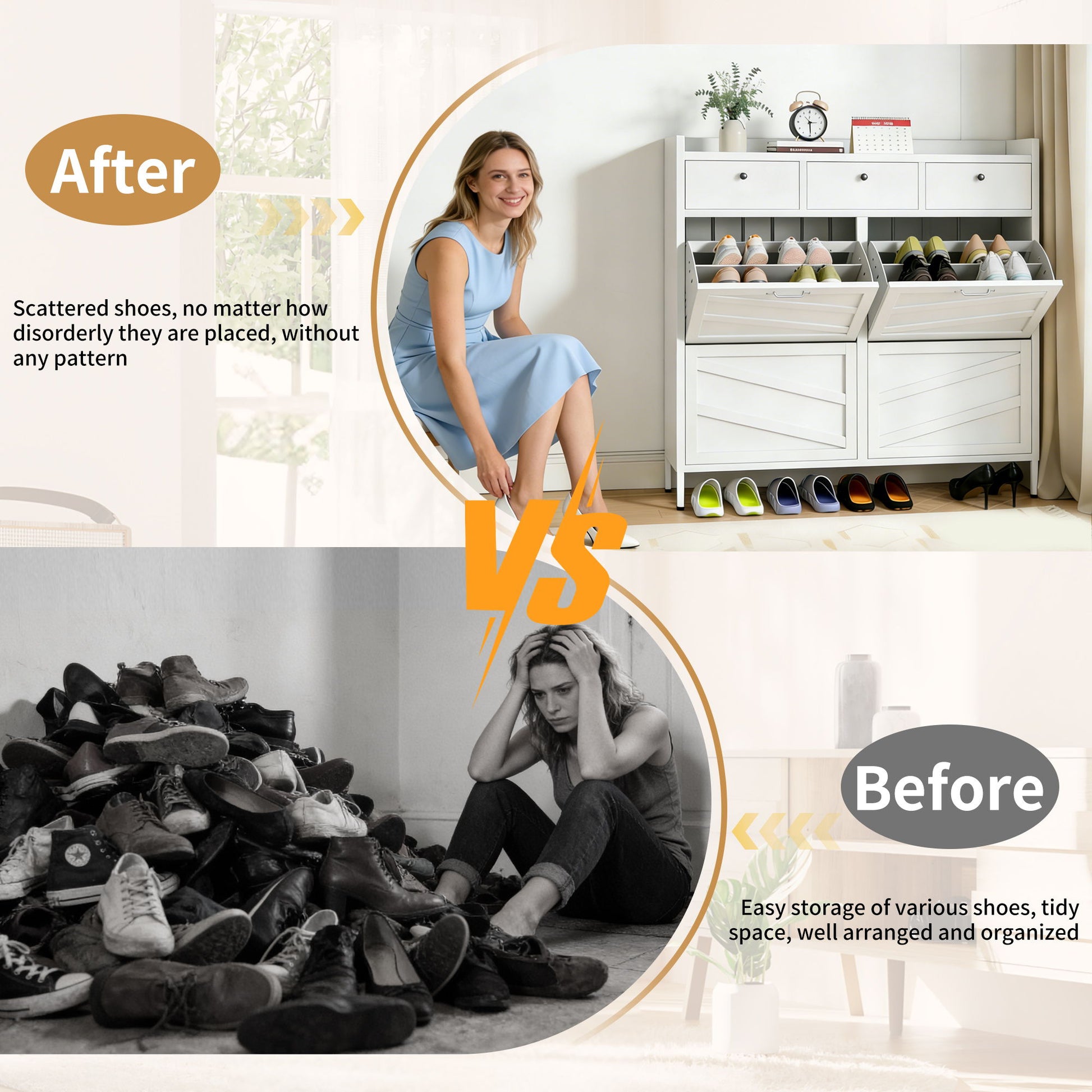 - Massive Hidden Storage: drawers and two upper drawers hold over 15 pairs of shoes with adjustable dividers for customized organization.