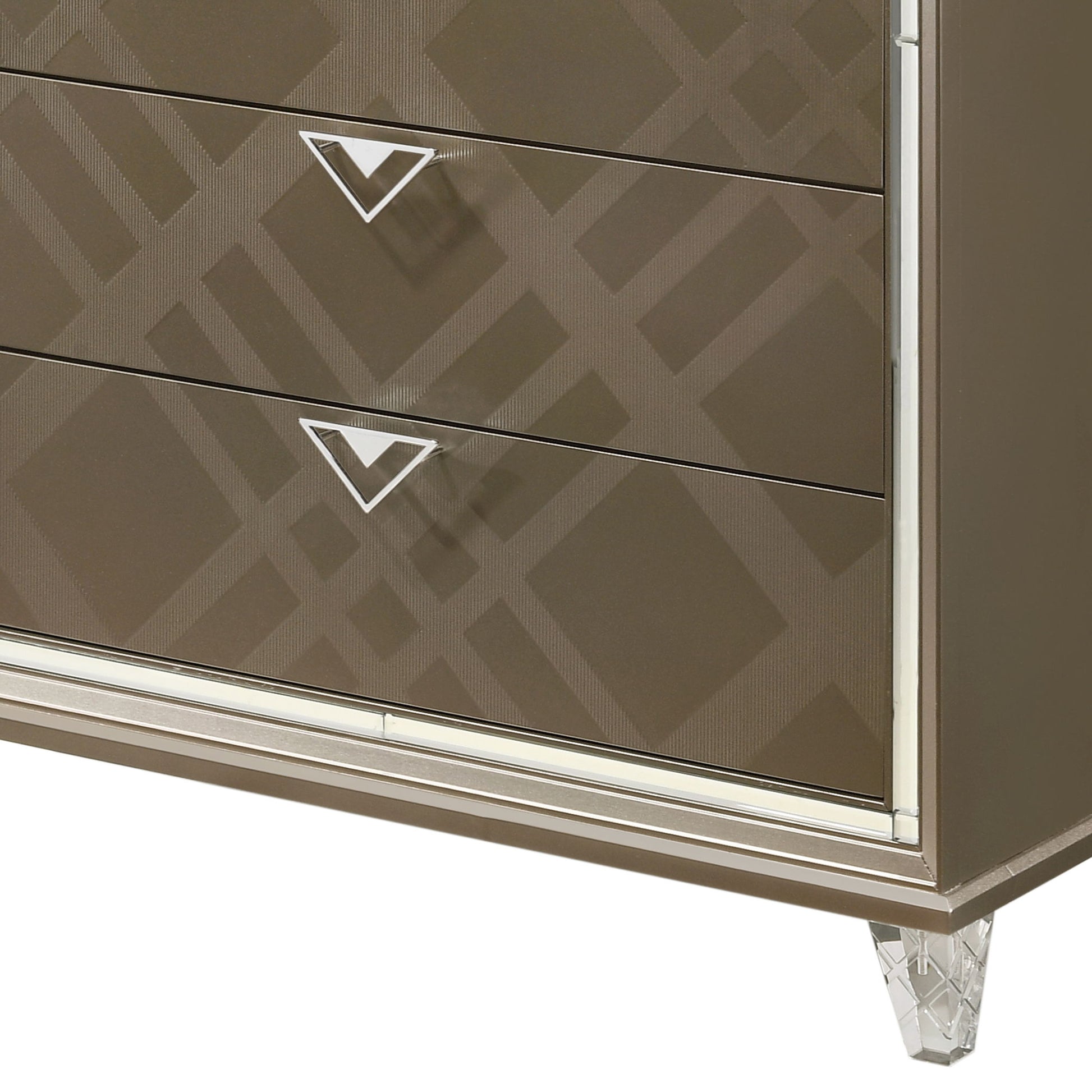 - Elegant Design: This sophisticated 5-drawer chest combines elegance with functionality, featuring embossed fronts that add subtle texture and depth to the design.