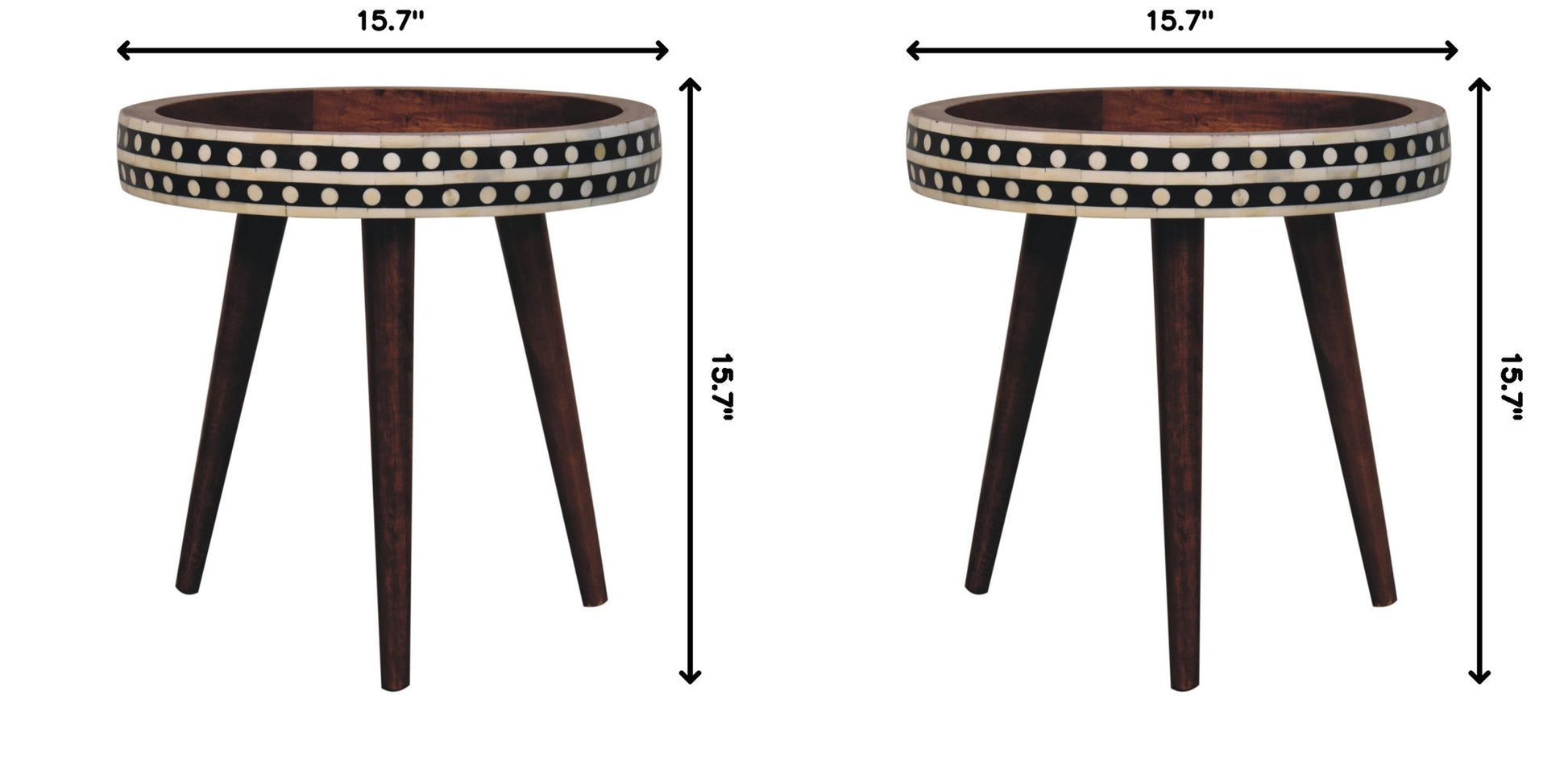 - Small Patterned Nordic Style End Table - This solid wood end table has made from 100% mango wood in a fine finish. The no-fuss finish reveals the beautiful grain of the mango wood which this piece of furniture is made of. This tripod table stands on Nordic style legs and features a and white bone inlay pattern on the edges. The bone is sourced responsibly from deceased animals such as camels, goats, and buffaloes.