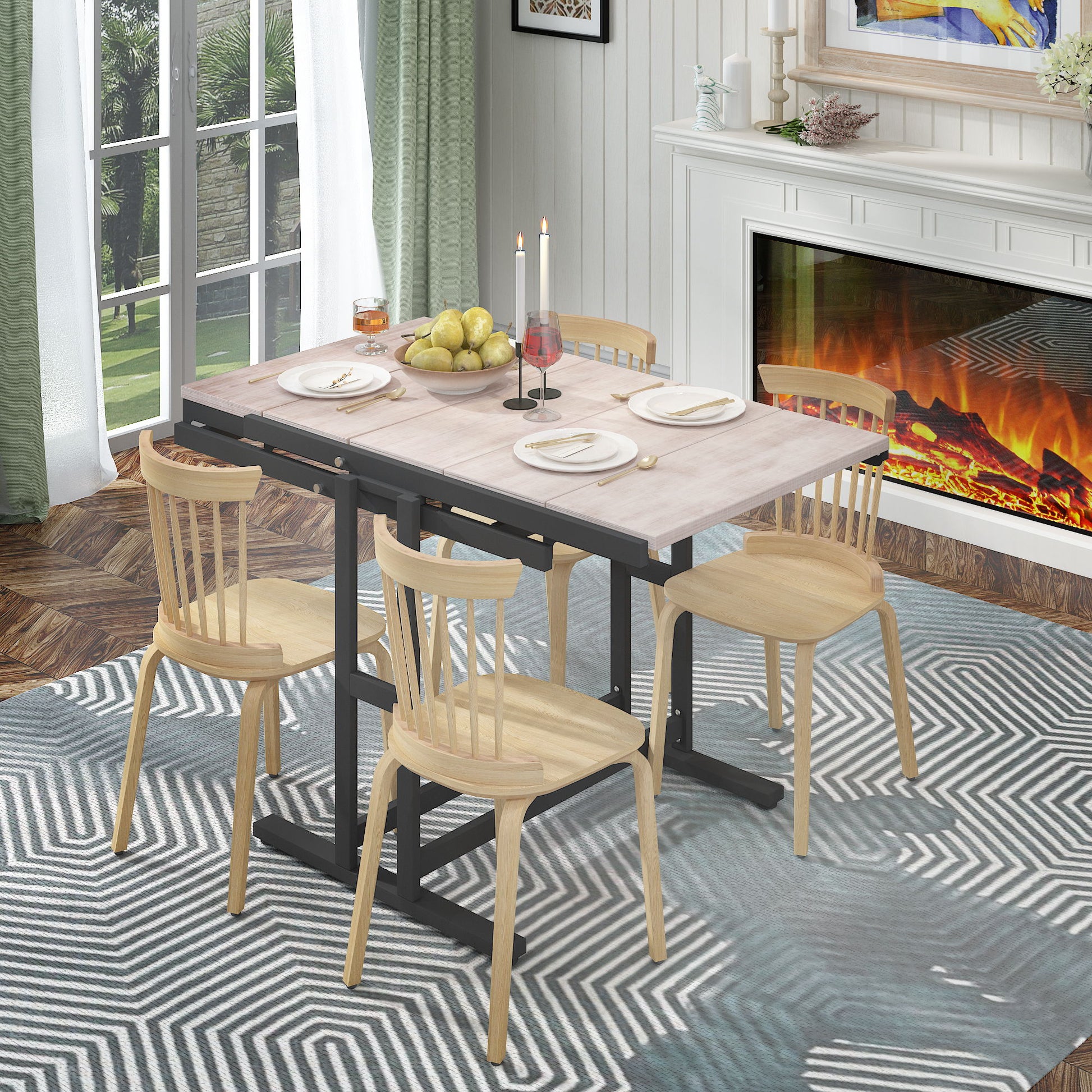 Solid Mahogany Wood Multifunction Convertible Dining Table, Free Switch Space-Saving Table, Shelf For Dining Room Or Kitchen - Beige / Black