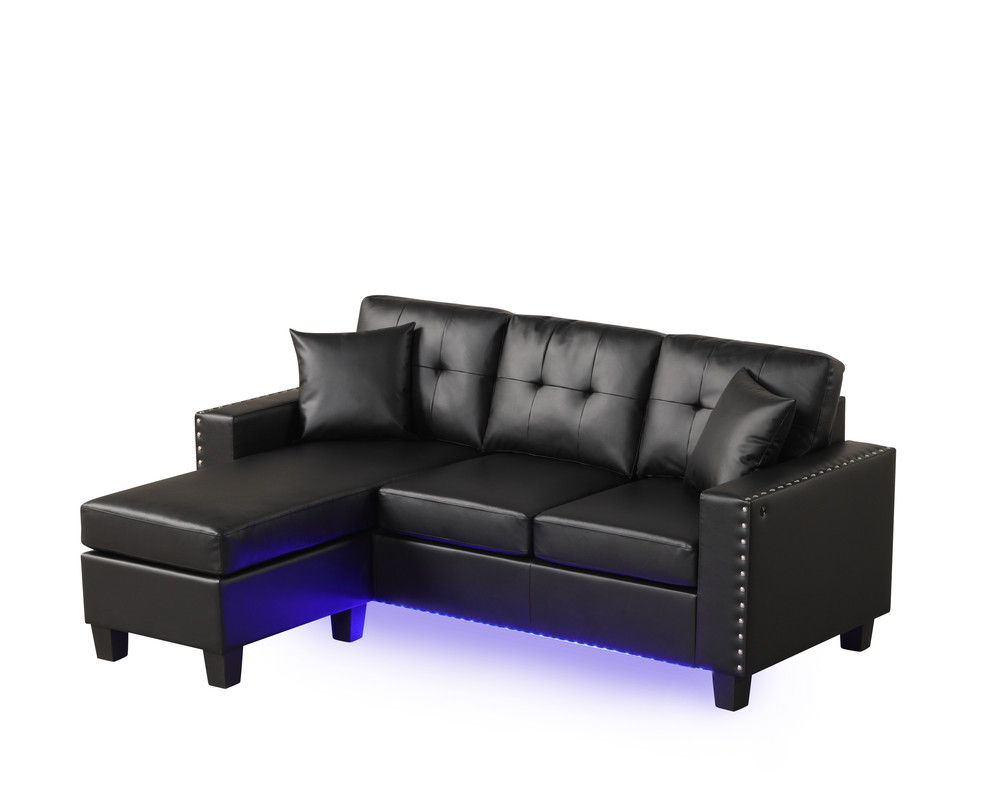 Sorenza 74"W Black PVC Reversible Sectional Sofa Chaise with LED Light, USB Port, Nailhead Trim, Throw Pillows, Tufted Cushion