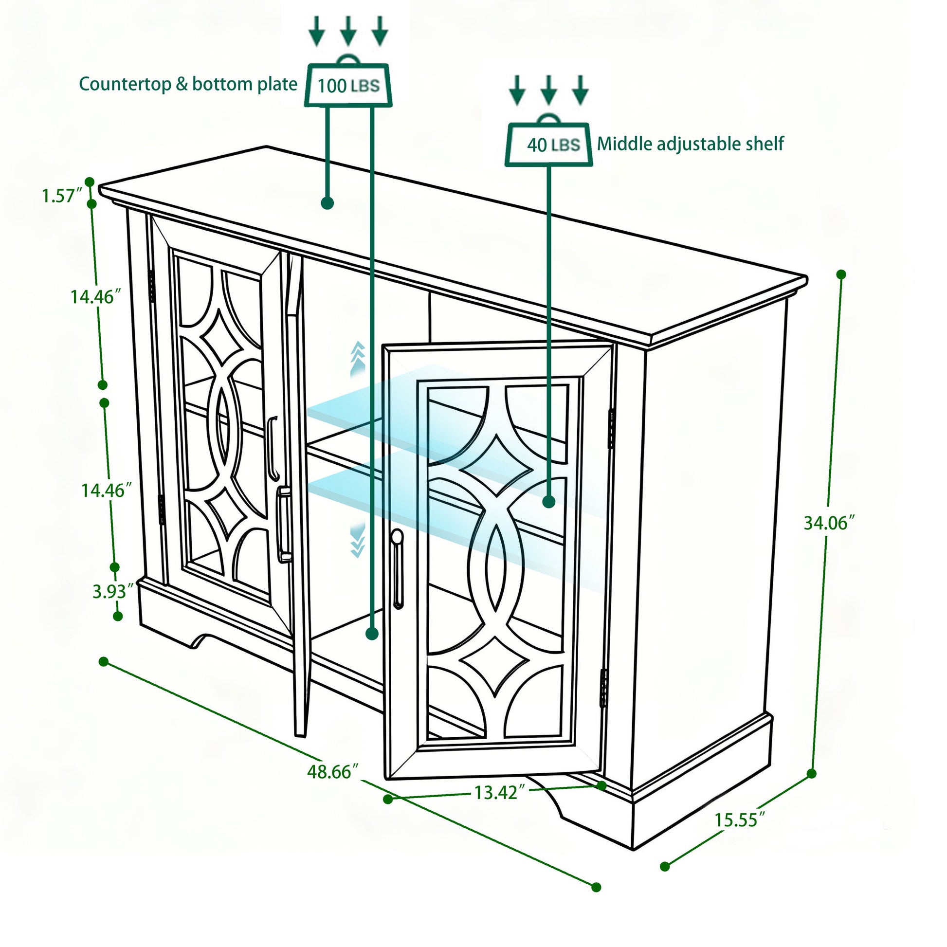 - Spacious Design: 48.66" W x 15.55" D x 34.06" dimensions with adjustable shelves offer versatile storage for dishes, decor, and kitchen essentials