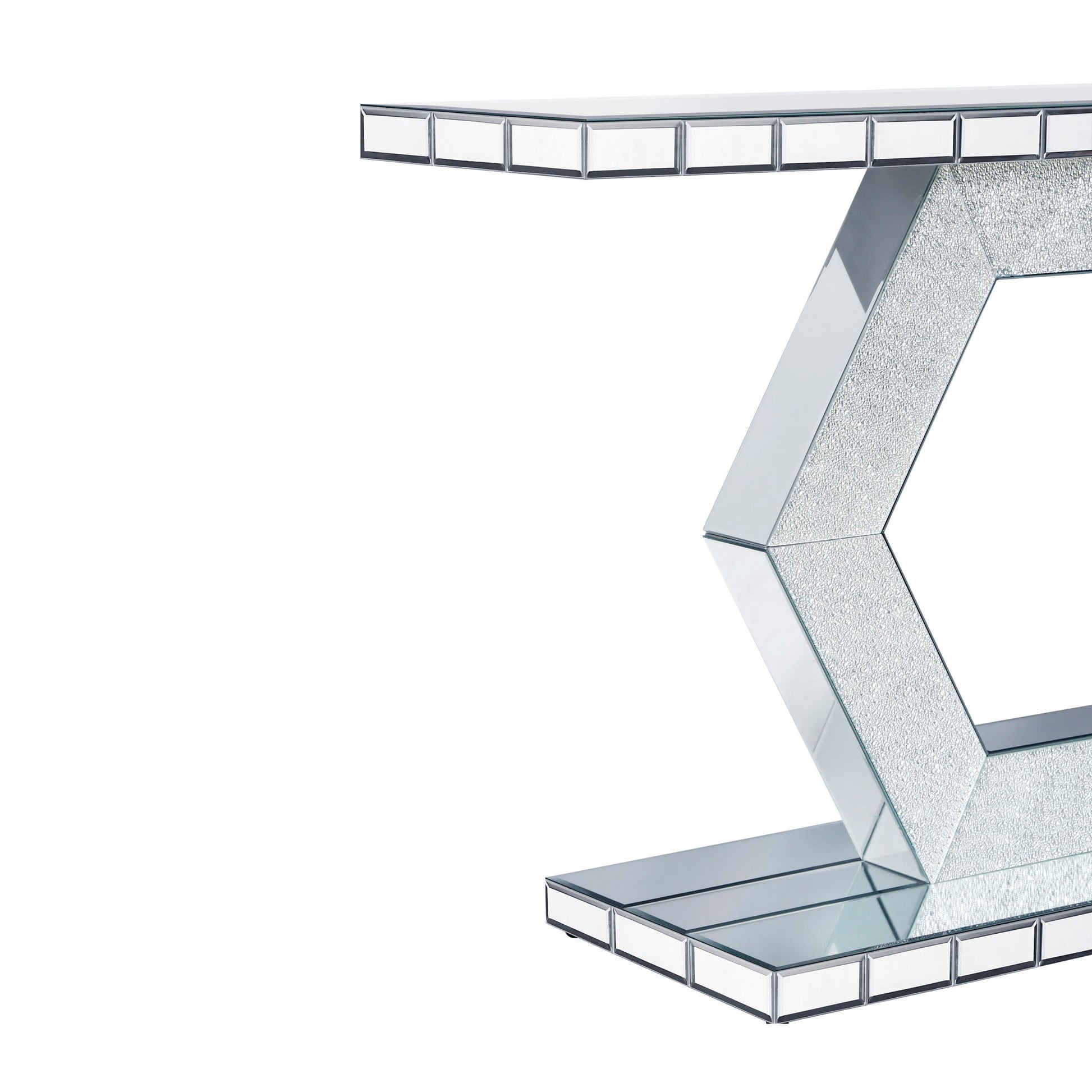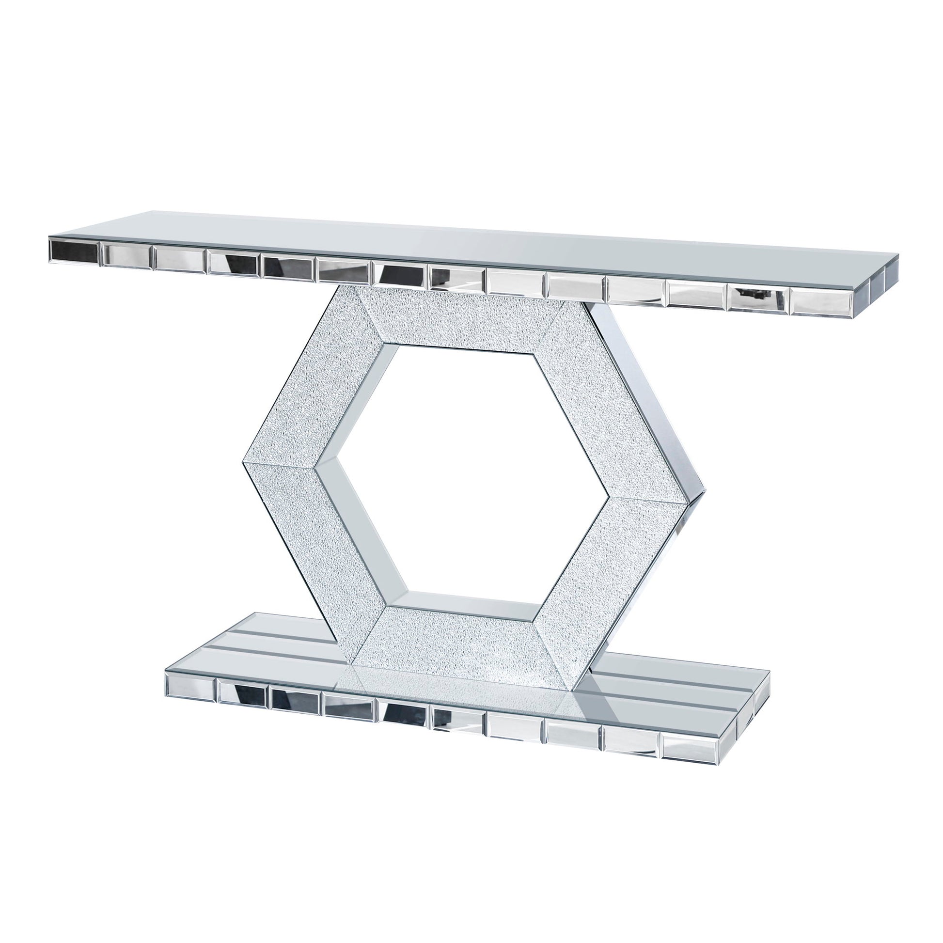 Sparkling Crystal Hexagon Mirror Entryway Premium Modern Foyer Console Table With Diamond Glass Effects, Dual Tier Luxury Sofa Table - Silver
