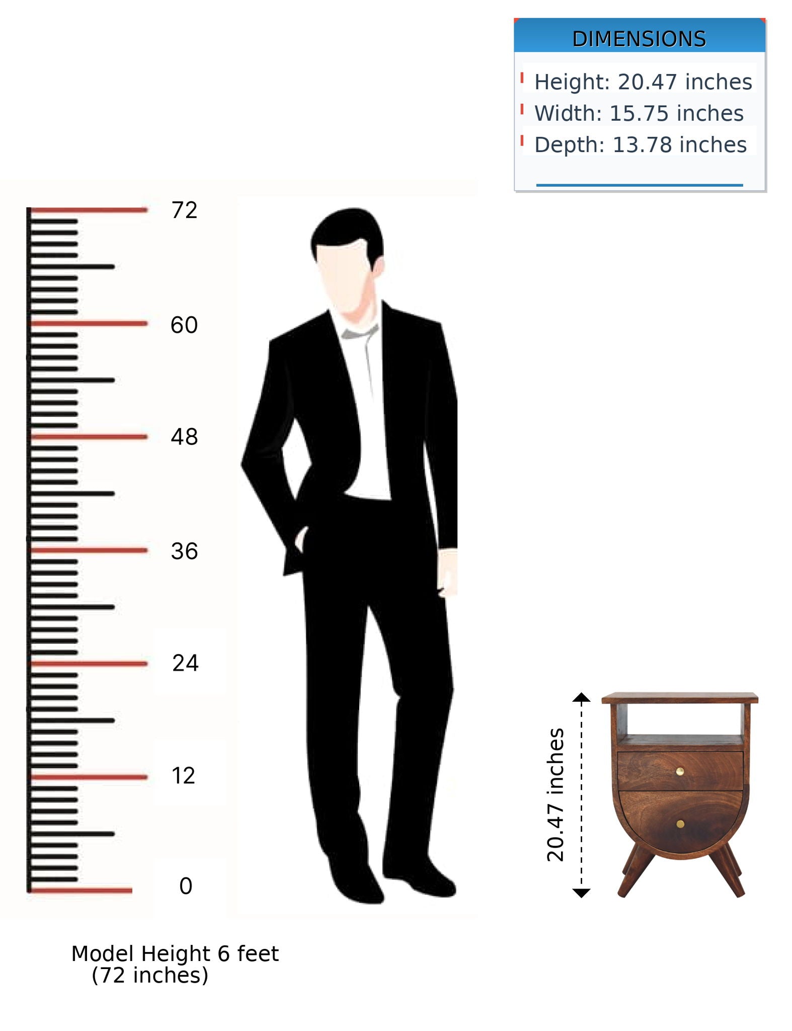 - Features: solid mango wood, chestnut finish, curved shaped, 2 drawers, open slot, brass knobs