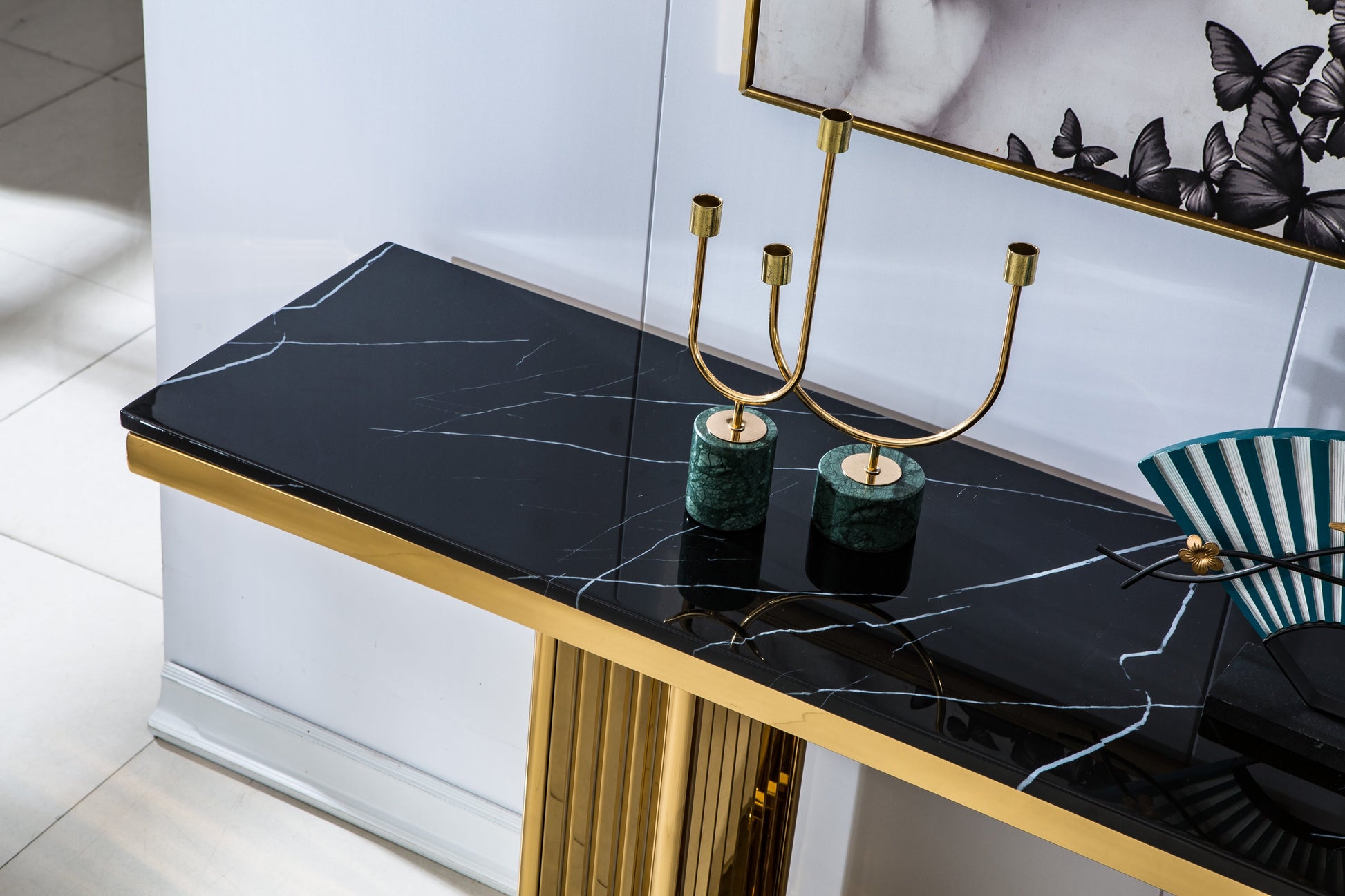Enhance your living space with this sophisticated console table, featuring a sleek 18mm black or grey marble top and a sturdy stainless steel base. The luxurious design is complemented by your choice of a gold or silver mirrored finish, adding a touch of elegance to any room. With its modern aesthetic and functional size, this table offers the perfect blend of style and practicality. Ideal for entryways, living rooms, or hallways, it provides a beautiful surface for displaying decor or storing essentials. Assembly is required, but the finished piece is worth the effort.
