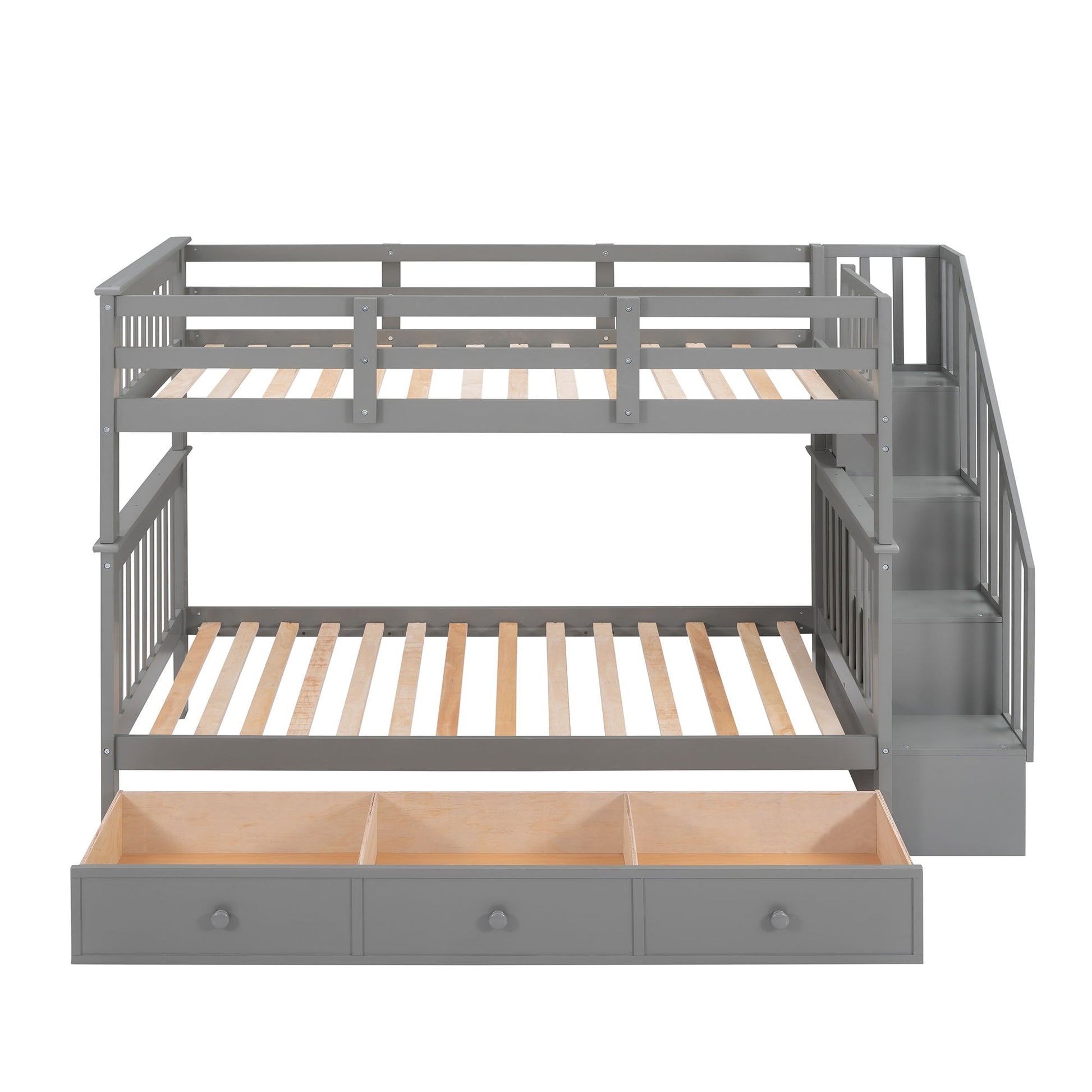 Twin Over Full Stairway Bunk Bed With Drawer, Storage And Guard Rail For Bedroom - Gray