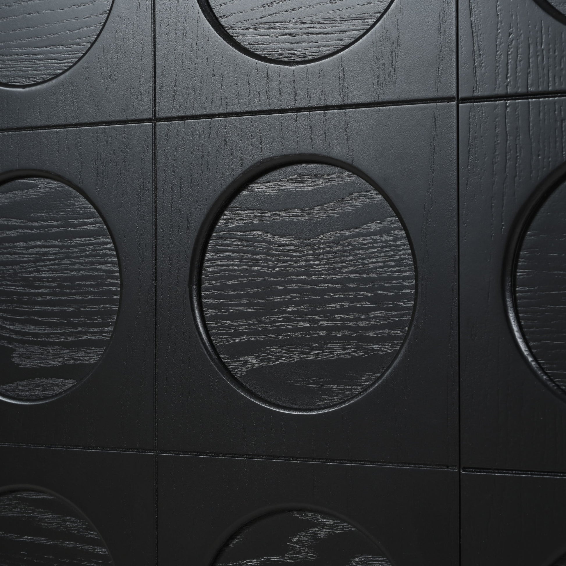 - [Unique Geometric Circle Door Design]: The cabinet door features a geometric circular shape with concave and convex elements, resembling a wall of black vinyl records. It blends seamlessly with any decor style, offering ample storage with aesthetic appeal
