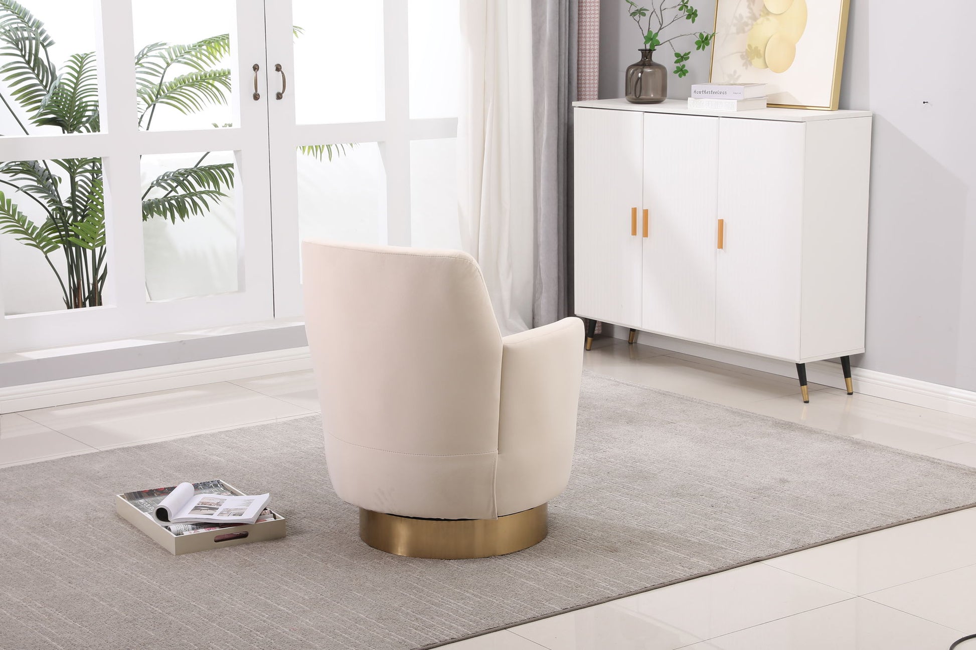 Velvet Swivel Barrel Chair, Swivel Accent Chairs Armchair For Living Room, Reading Chairs For Bedroom Comfy, Round Barrel Chairs With Gold Stainless Steel Base - Beige
