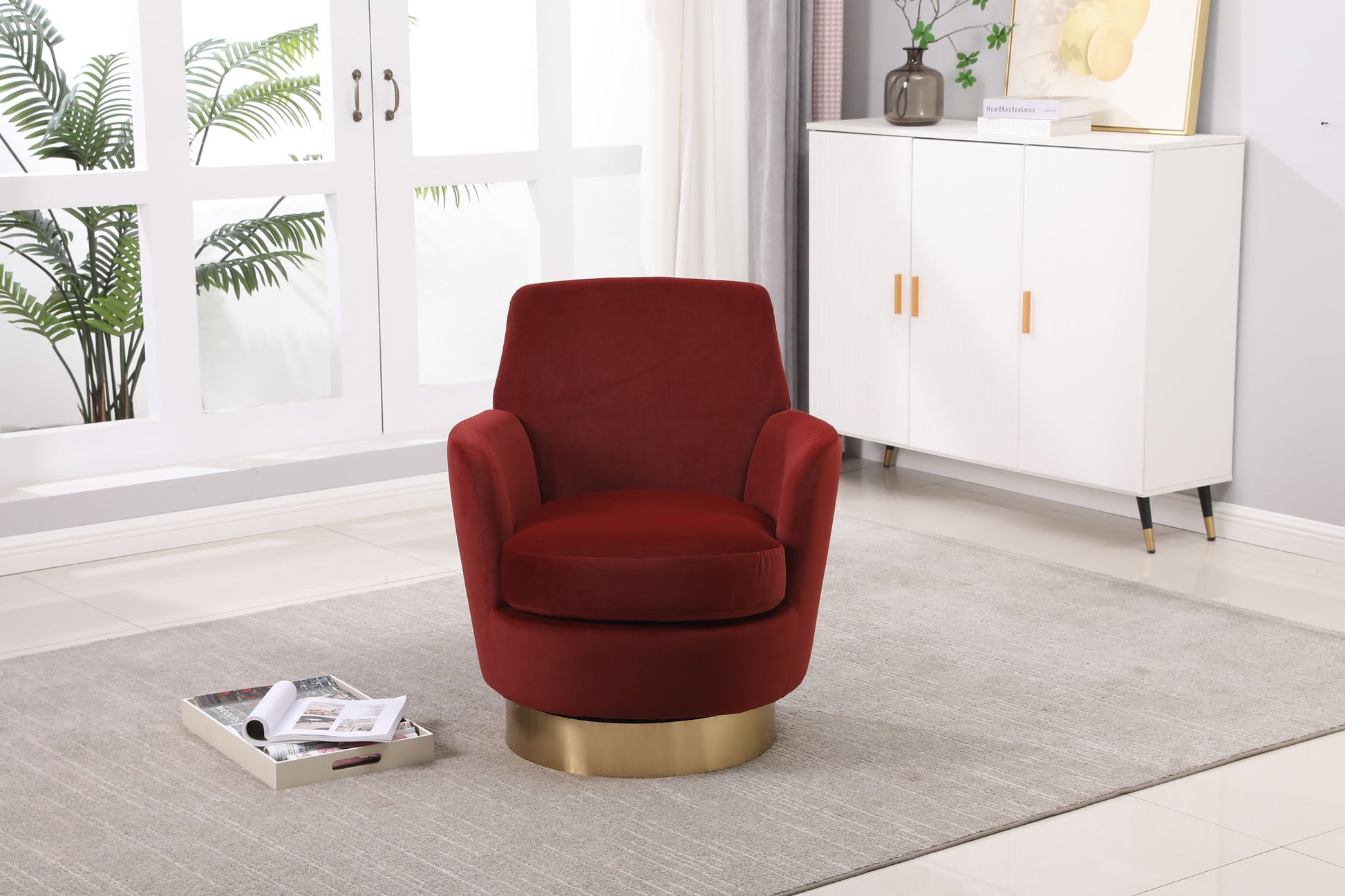 Velvet Swivel Barrel Chair, Swivel Accent Chairs Armchair For Living Room, Reading Chairs For Bedroom Comfy, Round Barrel Chairs With Gold Stainless Steel Base - Brownish Red