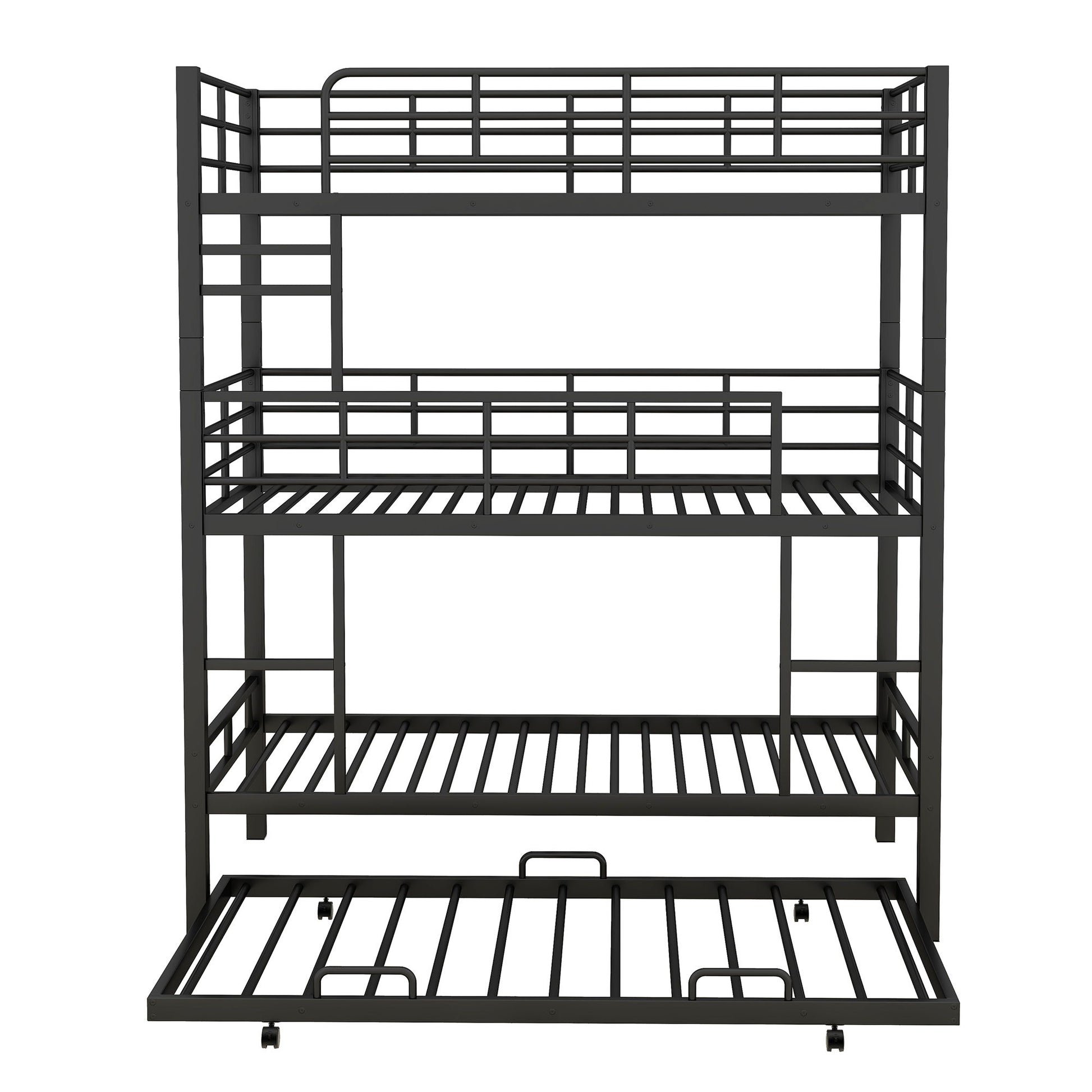 Twin Size Triple Bunk Bed With Trundle, Steel Construction With Heavy Duty Support And Secure Guardrails - Antique Black