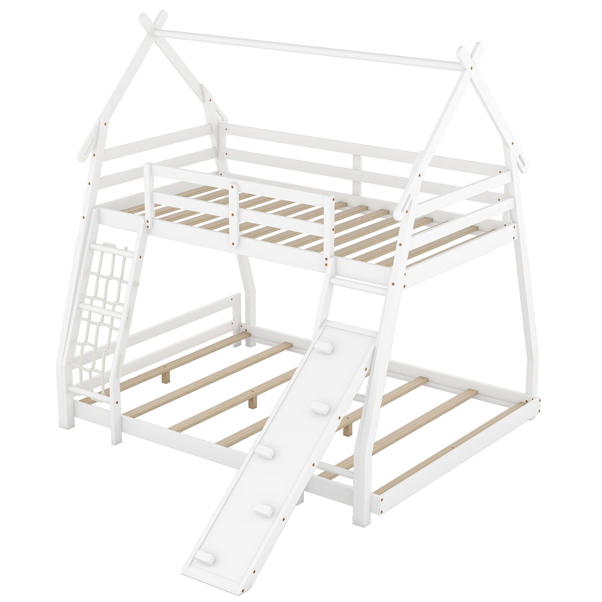 Twin Over Queen House Bunk Bed With Climbing Nets And Climbing Ramp - White