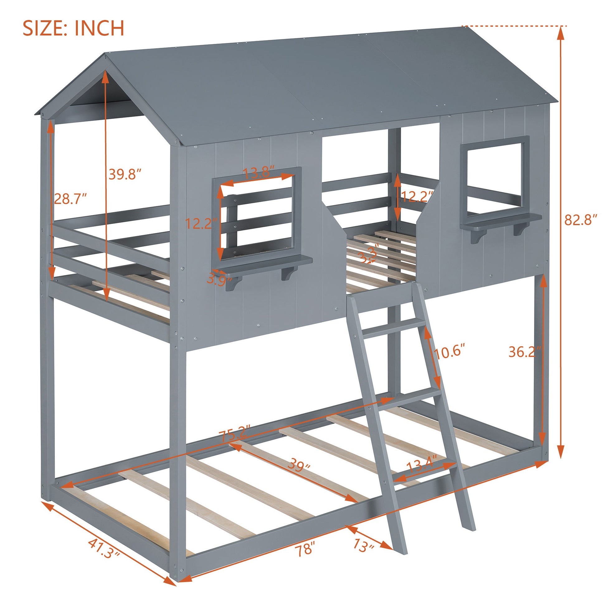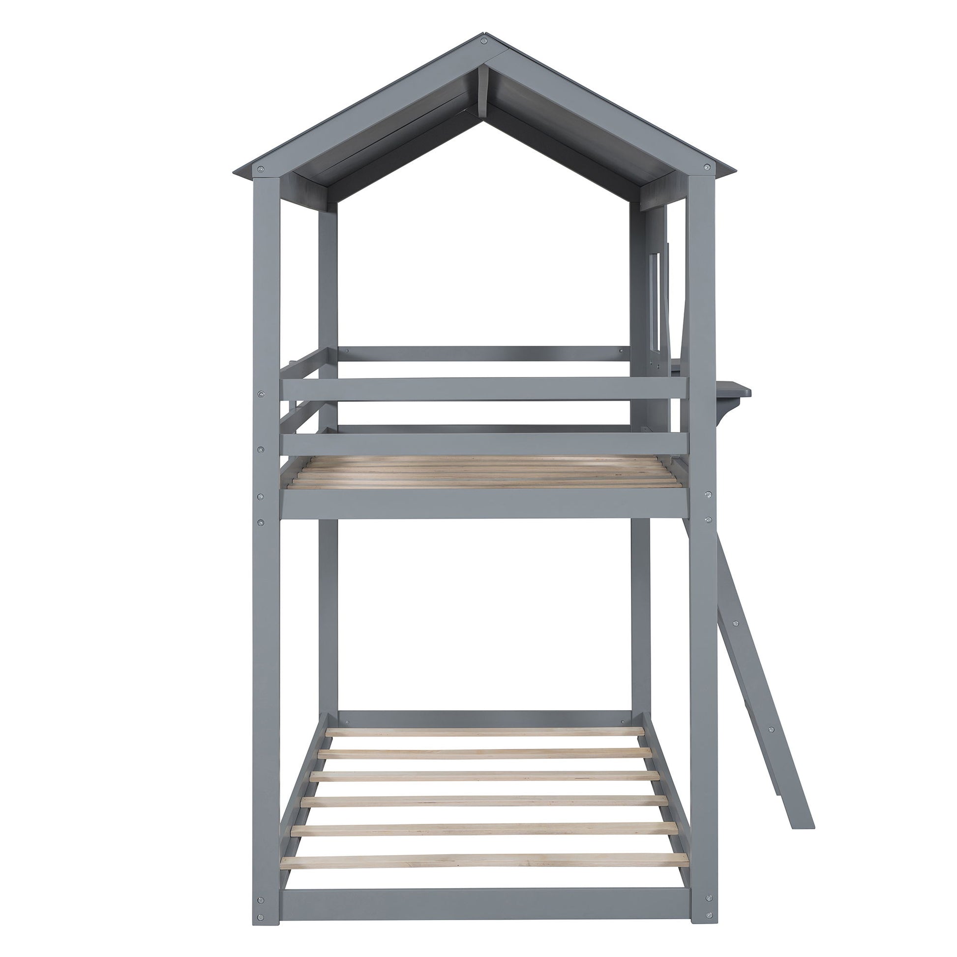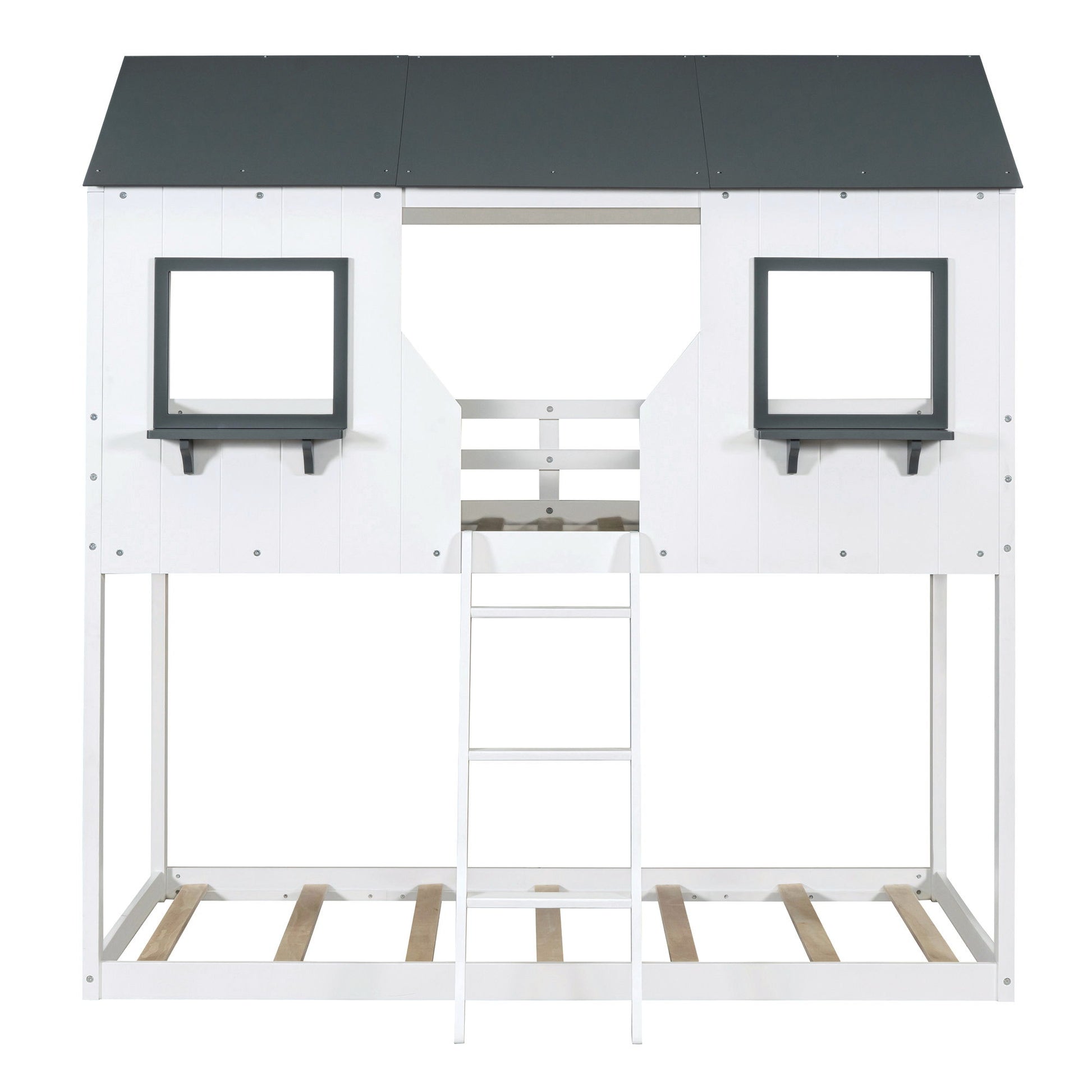 Twin Over Twin Bunk Bed With Roof, Window, Guardrail, Ladder - Gray