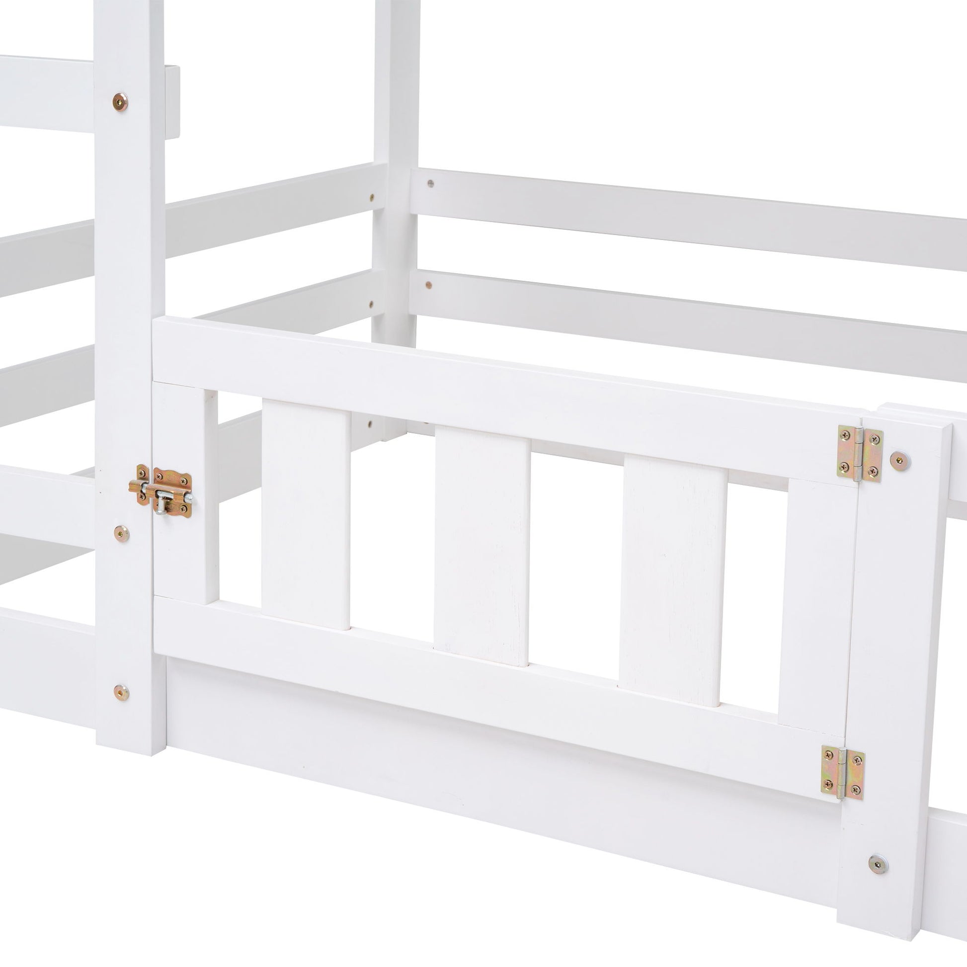 Twin Over Twin House Bunk Bed With Fence And Door - White