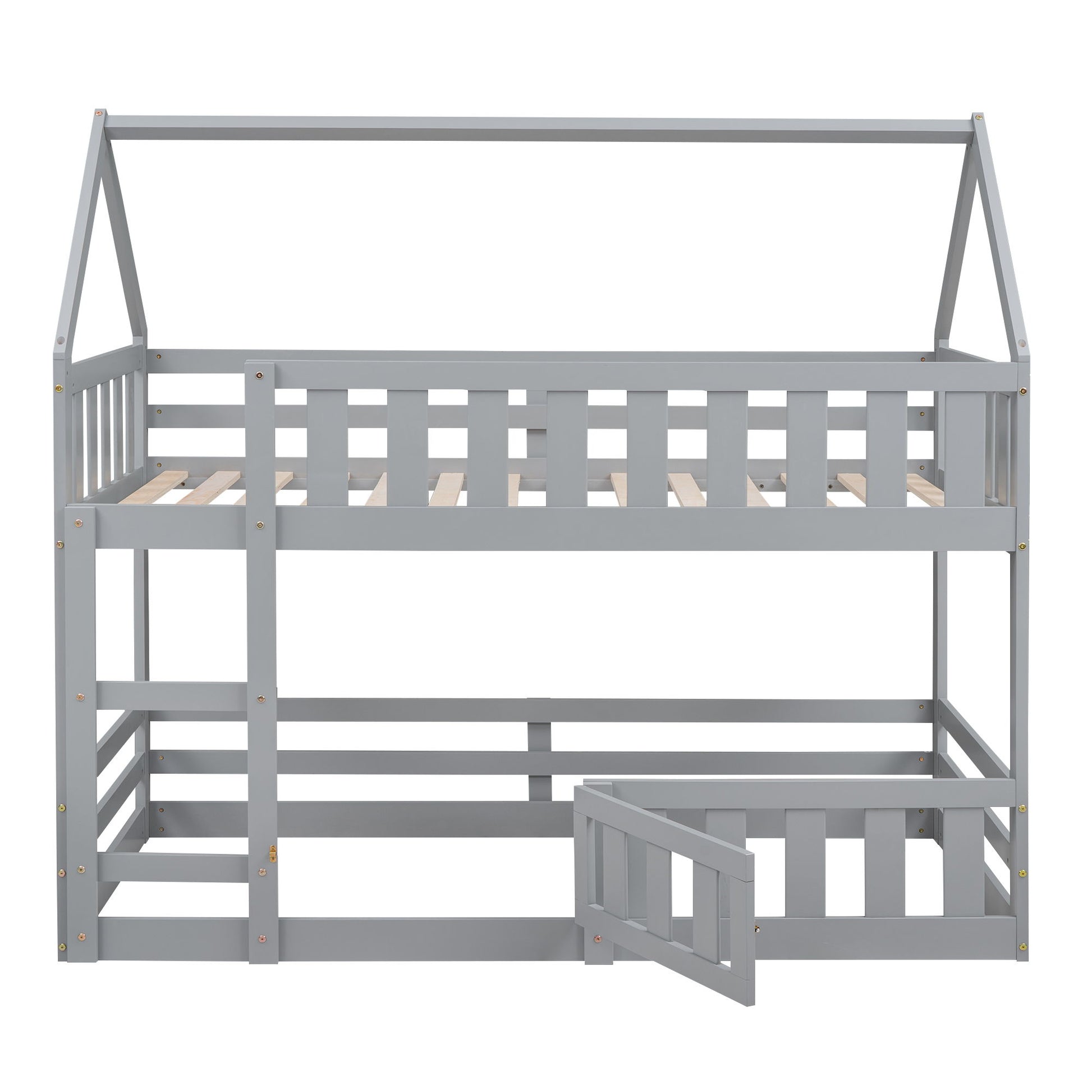 Twin Over Twin House Bunk Bed With Fence And Door - Gray