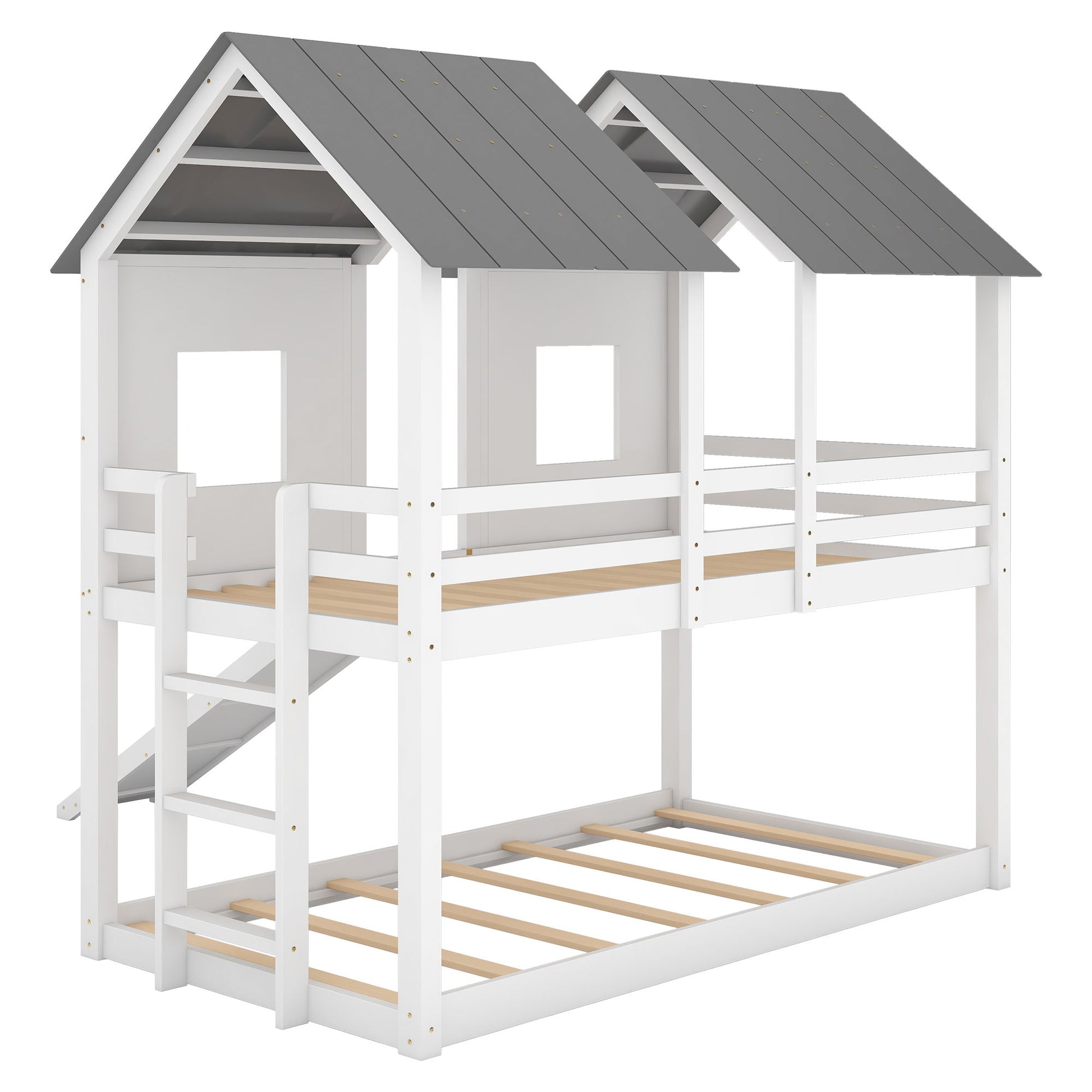 Twin Over Twin House Bunk Bed With Slide And Windows - White / Gray