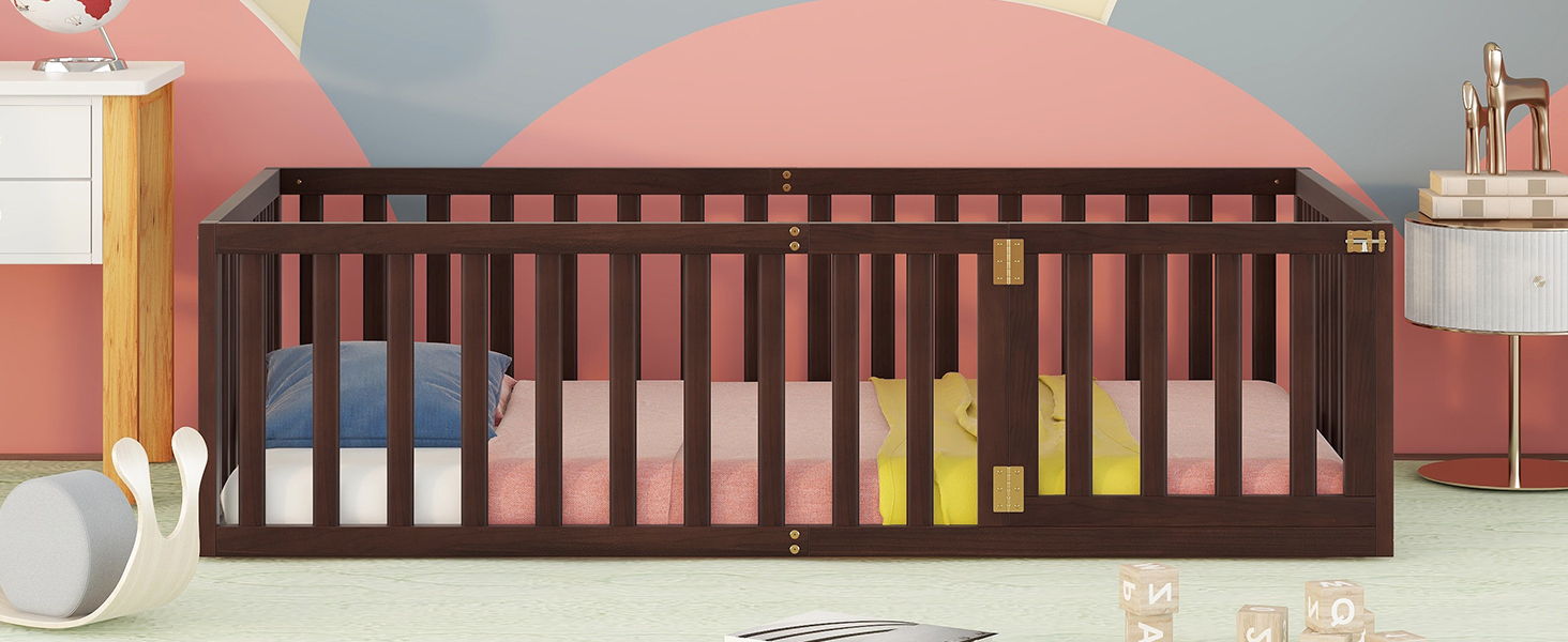 Twin Size Floor Bed Frame With Fence And Door - Walnut
