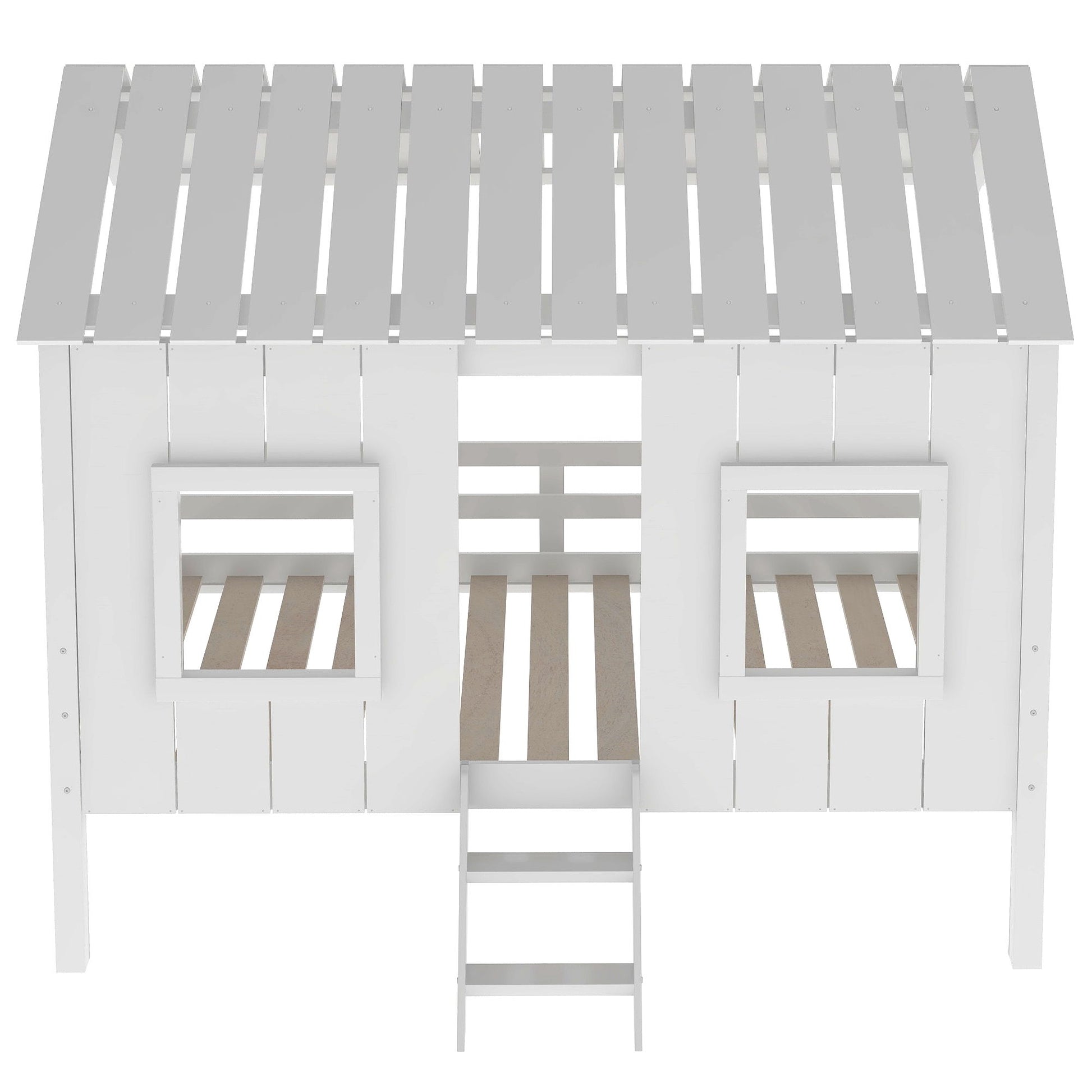 Twin Size Low Loft House Bed With Roof And 2 Front Windows - White