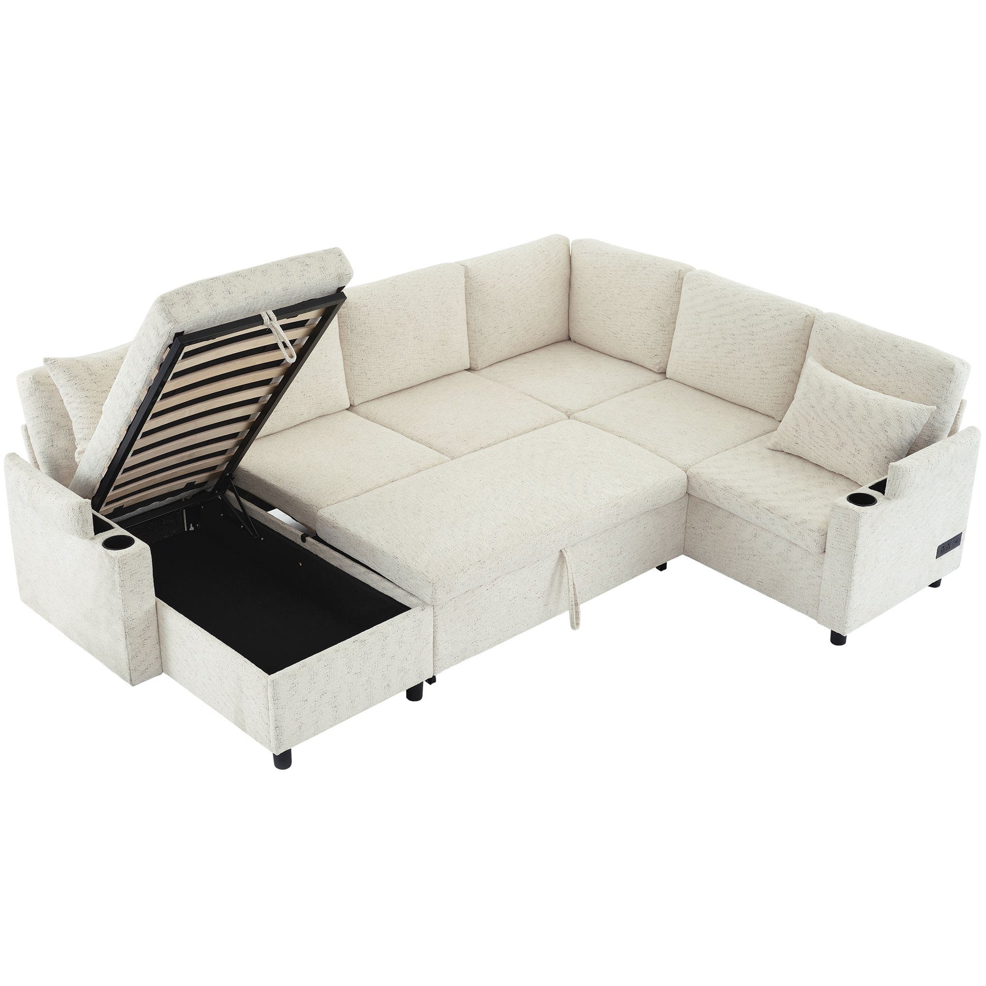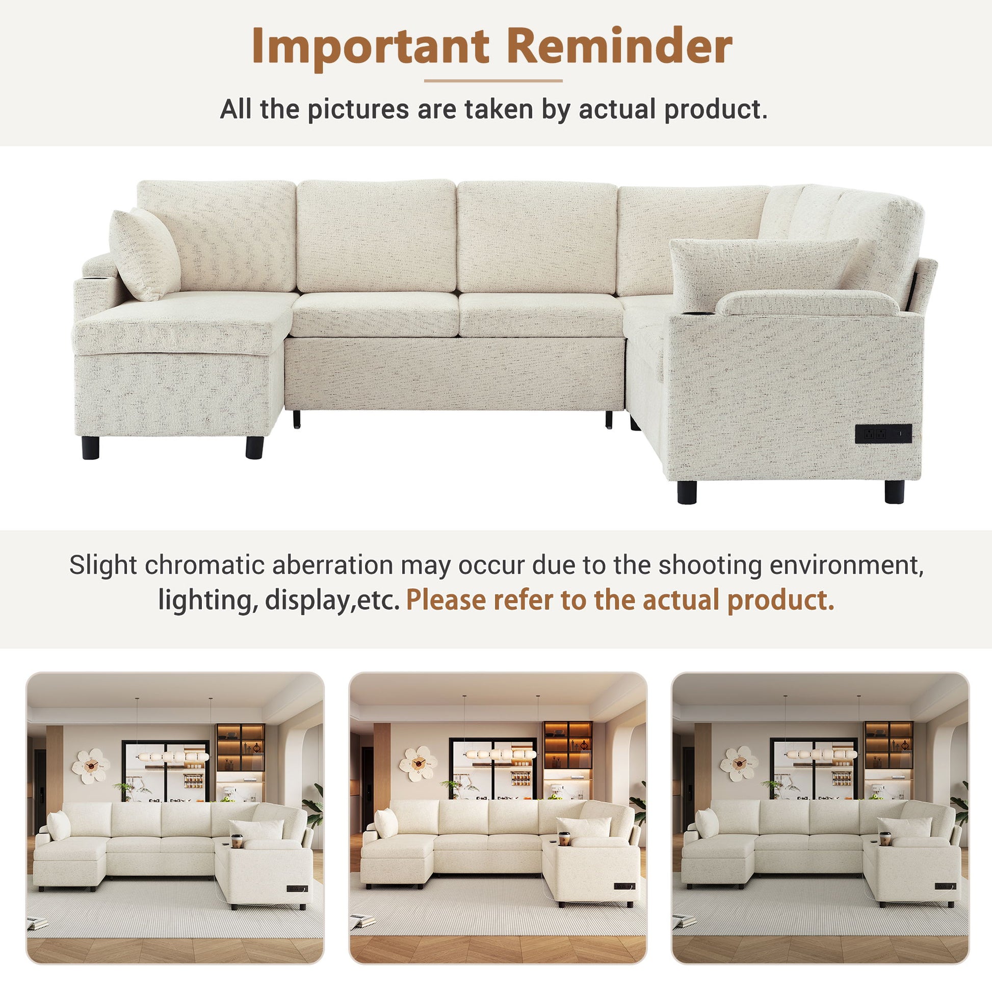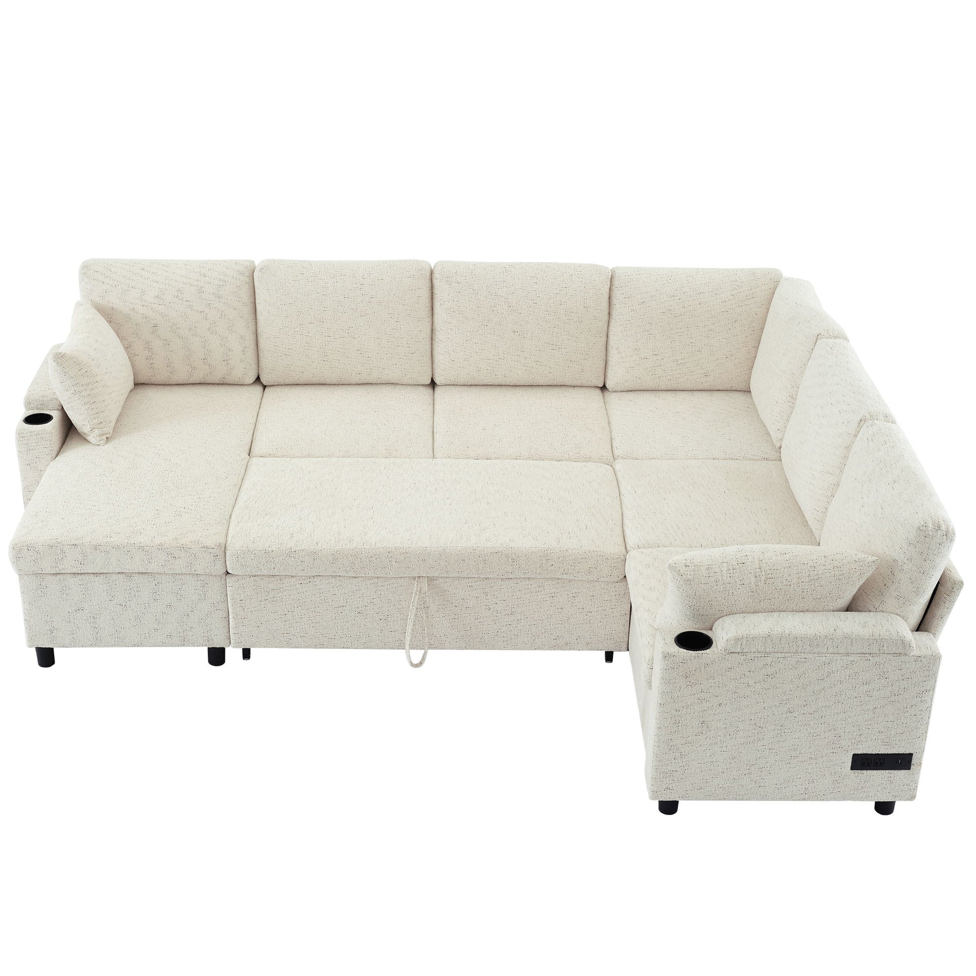 Sectional Sofa Versatile Sofa Bed Sofa Sleeper U - Shaped Sofa With Ample Storage Space, 2 Cup Holders And Charging Ports For Living Room - Beige