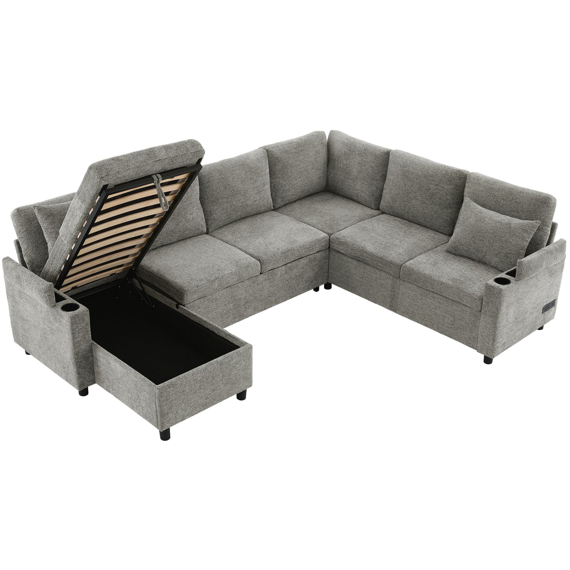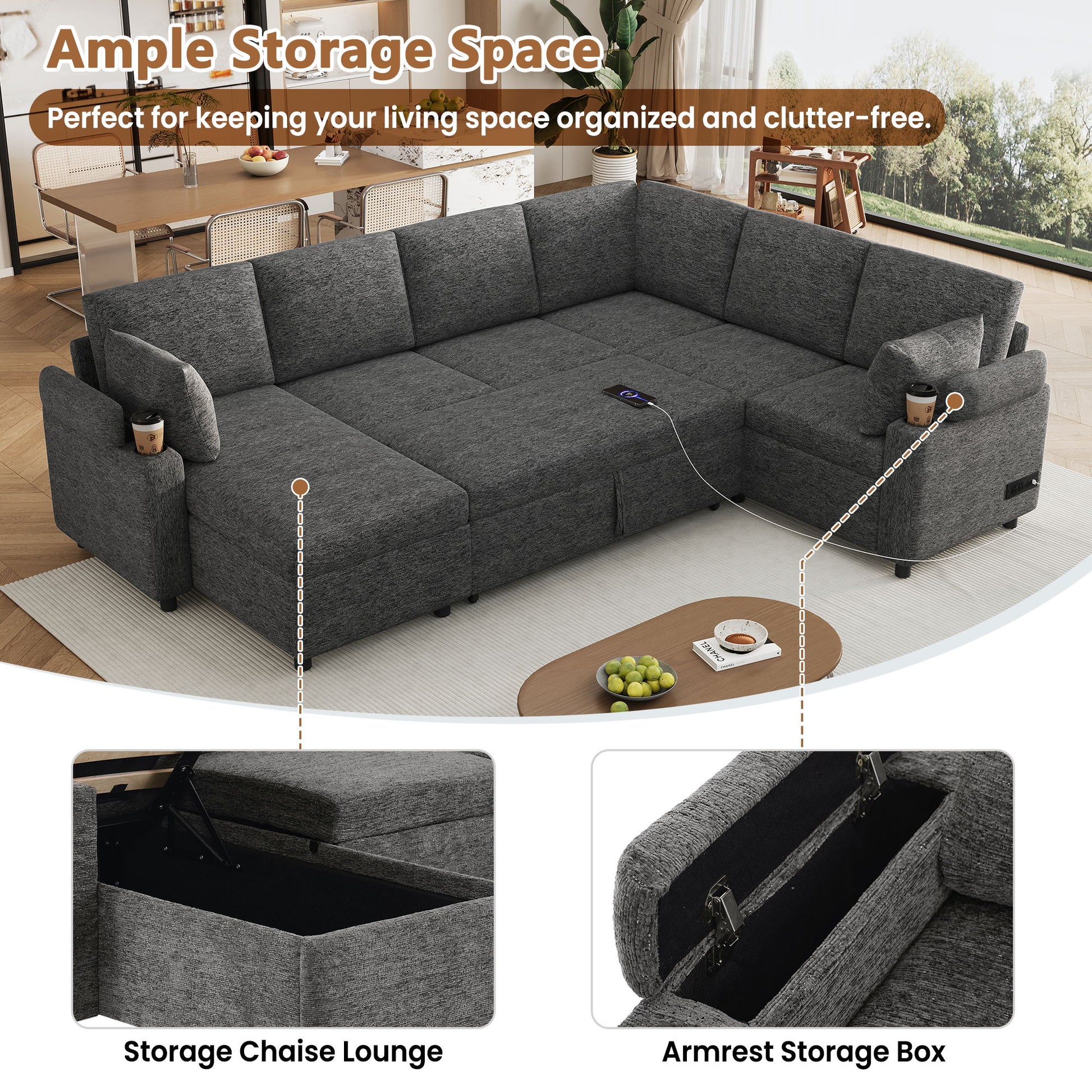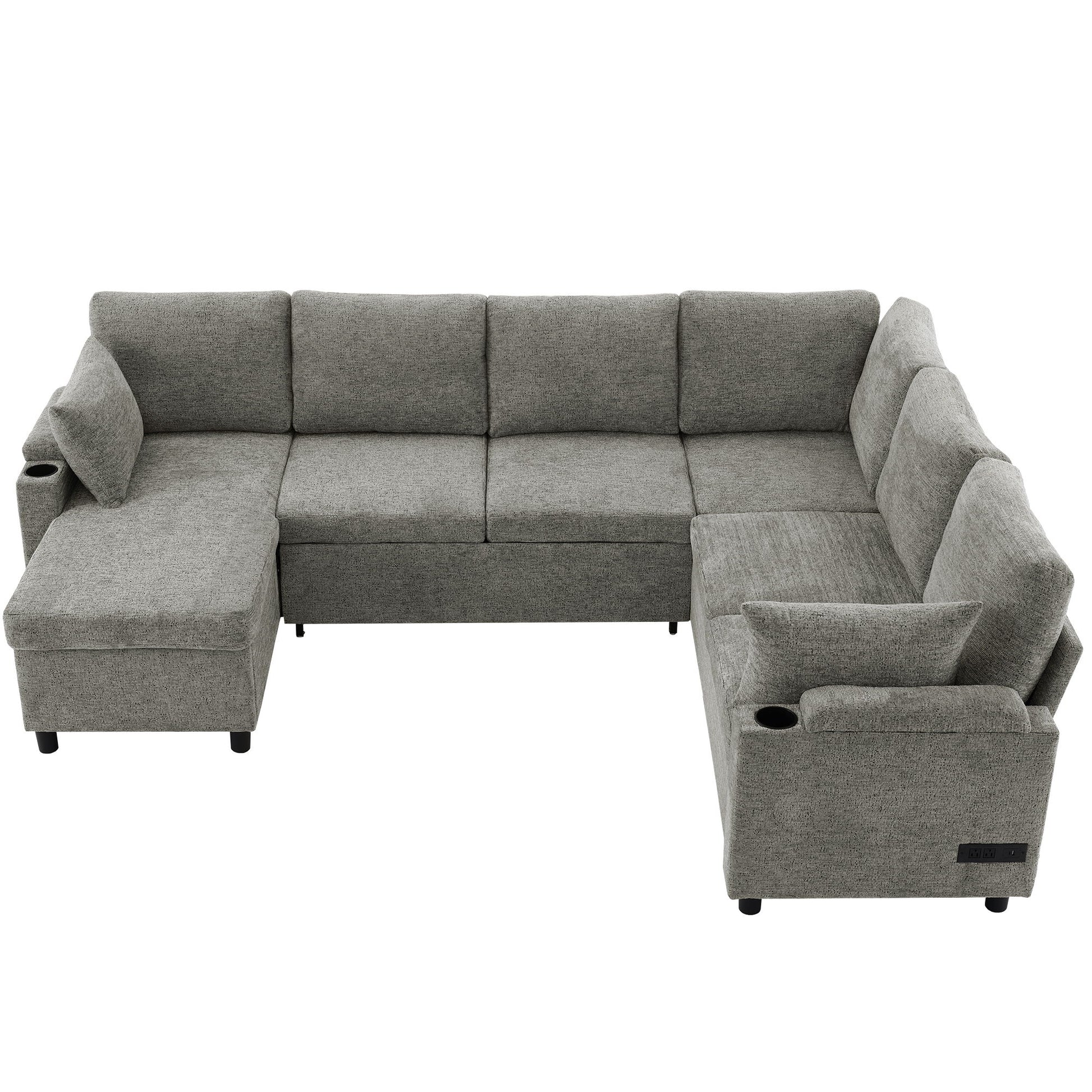 U-Shaped Sectional Sleeper Sofa With Ample Storage Space, 2 Cup Holders And Charging Ports For Living Room