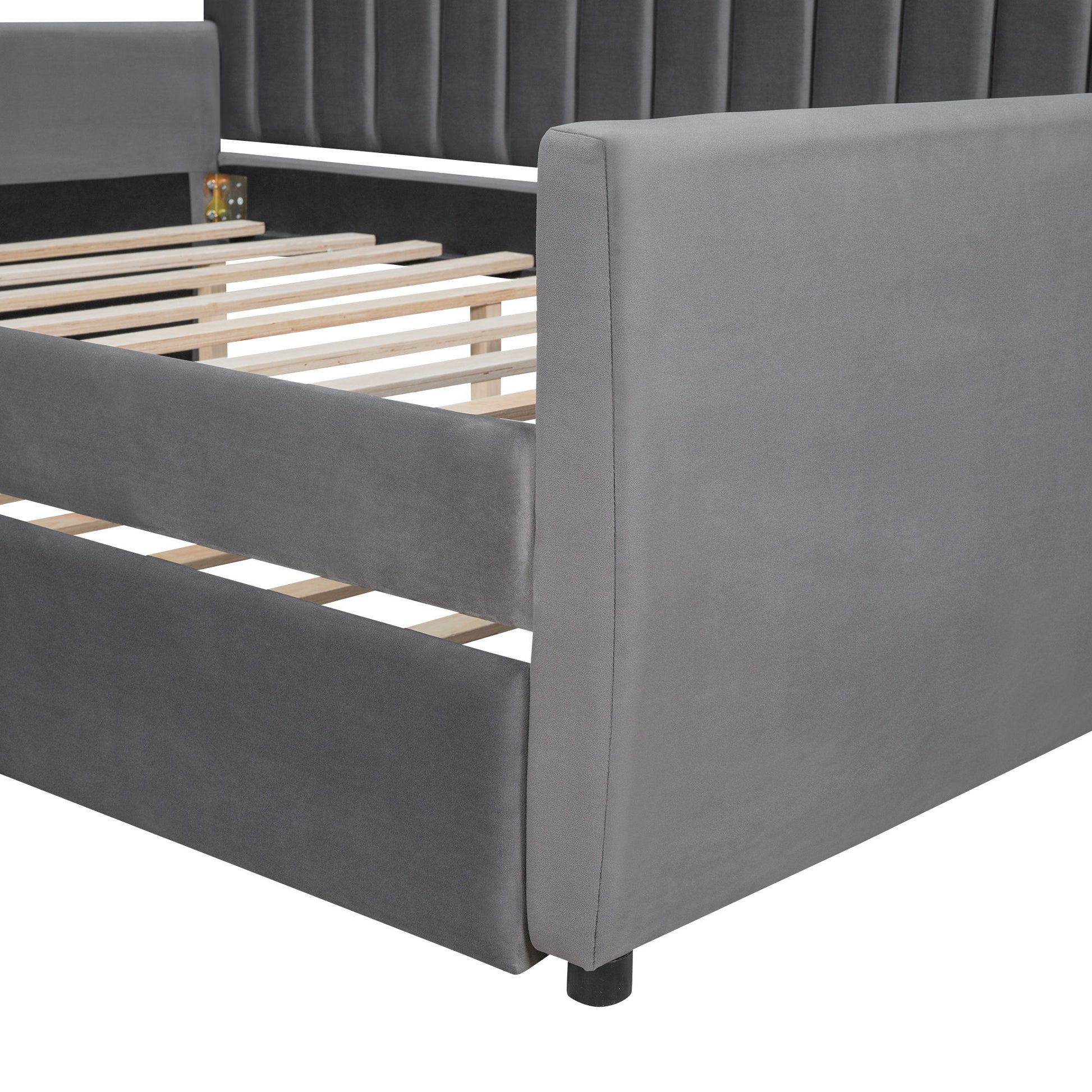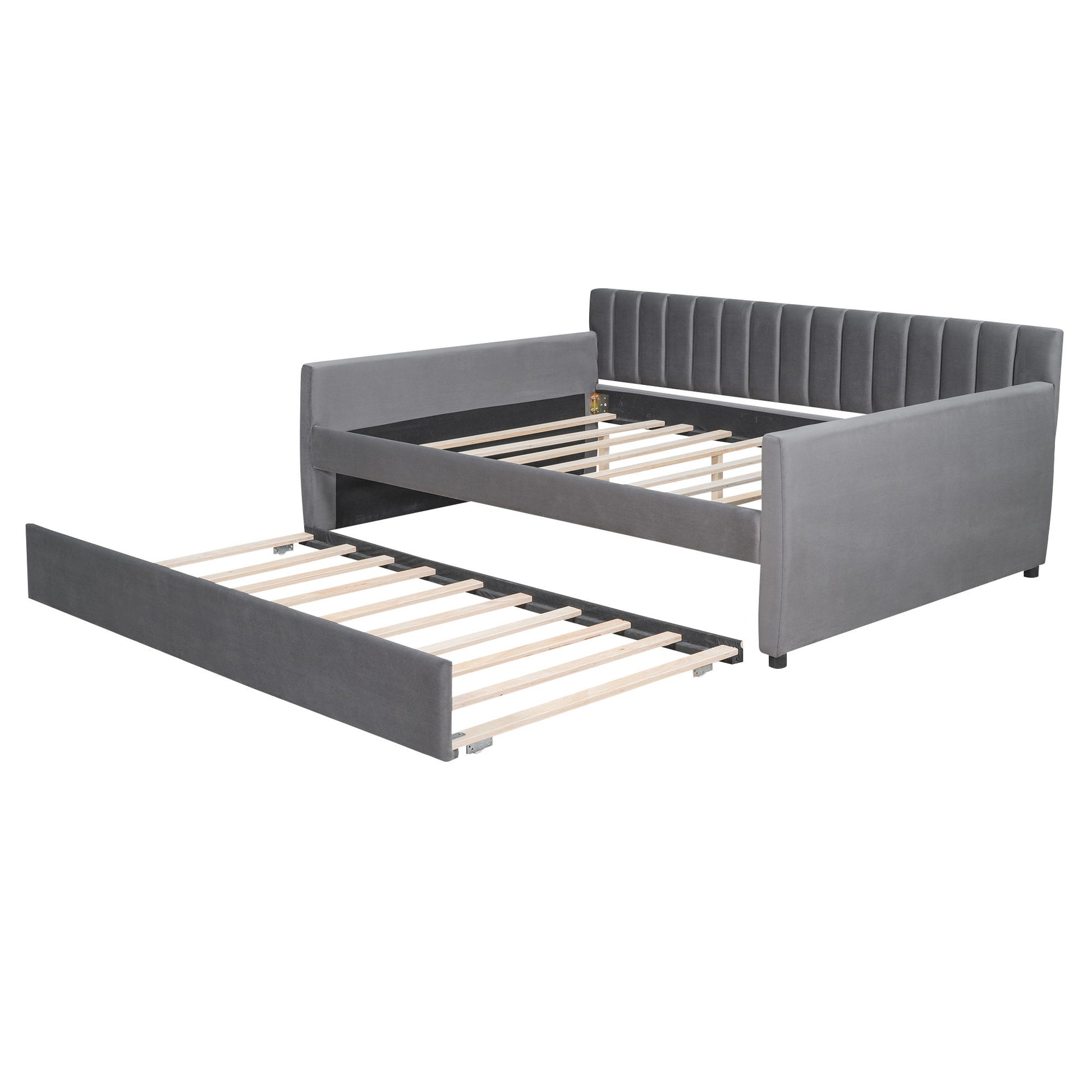 Full Size Upholstered Daybed With Trundle And Slat Support - Gray