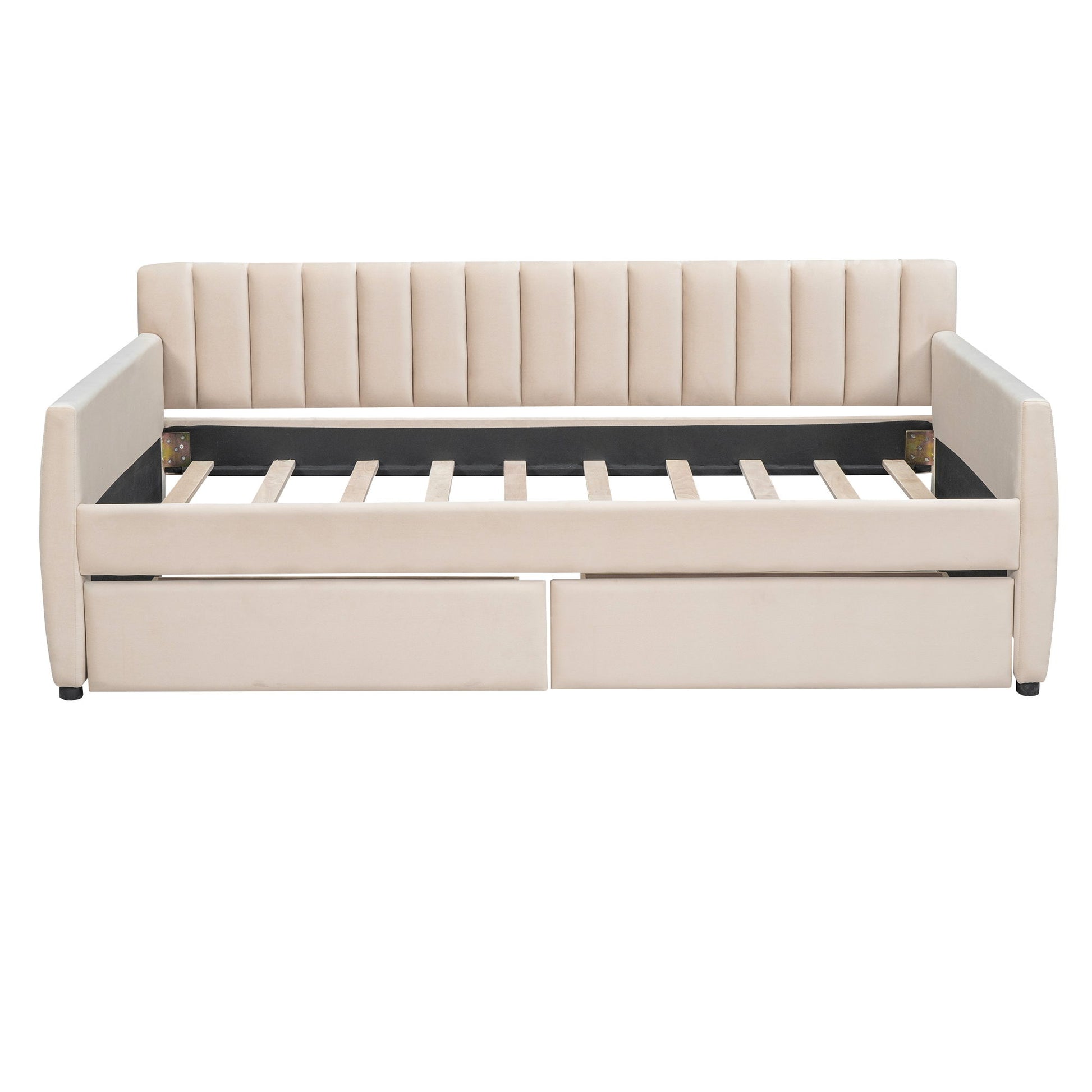Twin Size Upholstered Daybed & Drawers, Slat Support - Beige