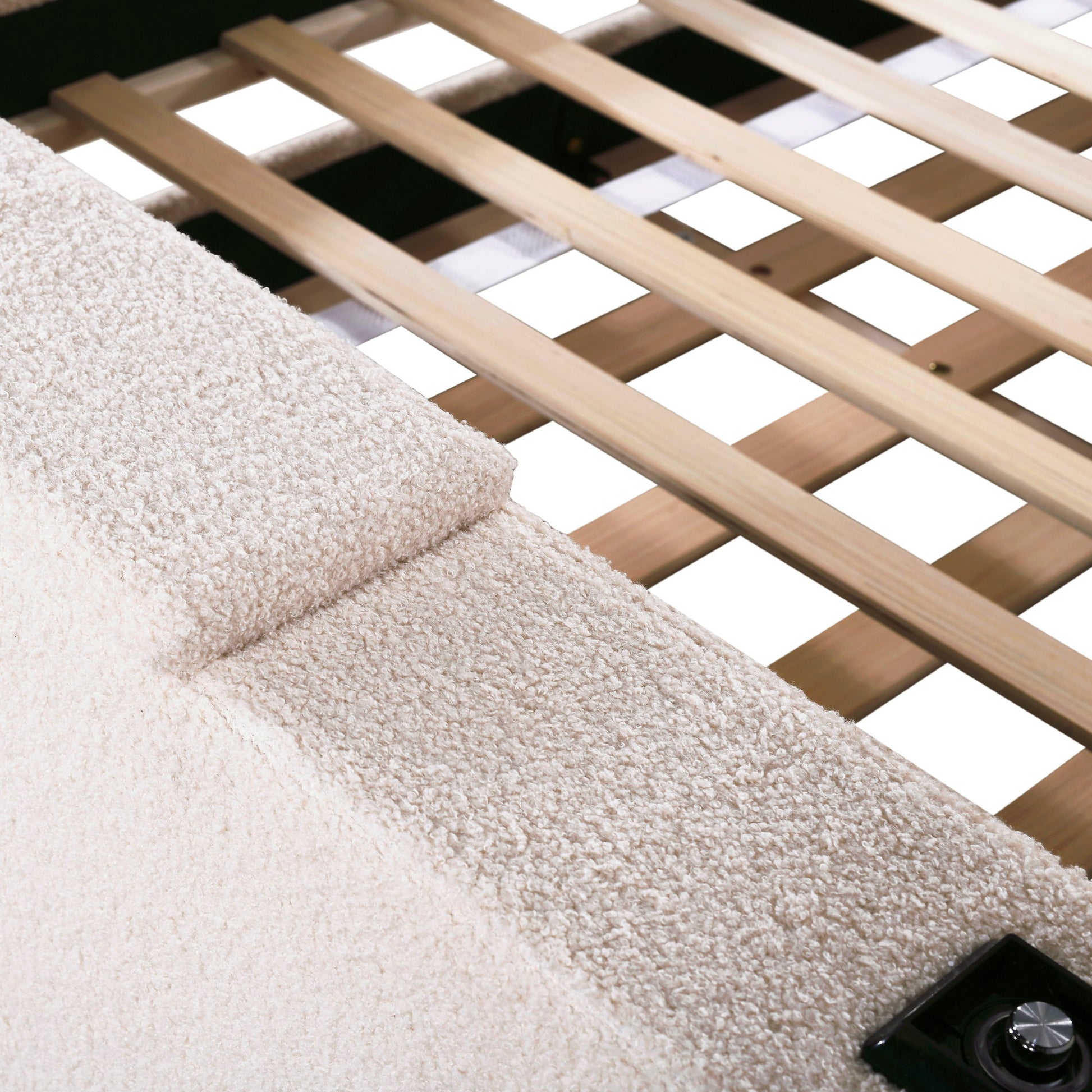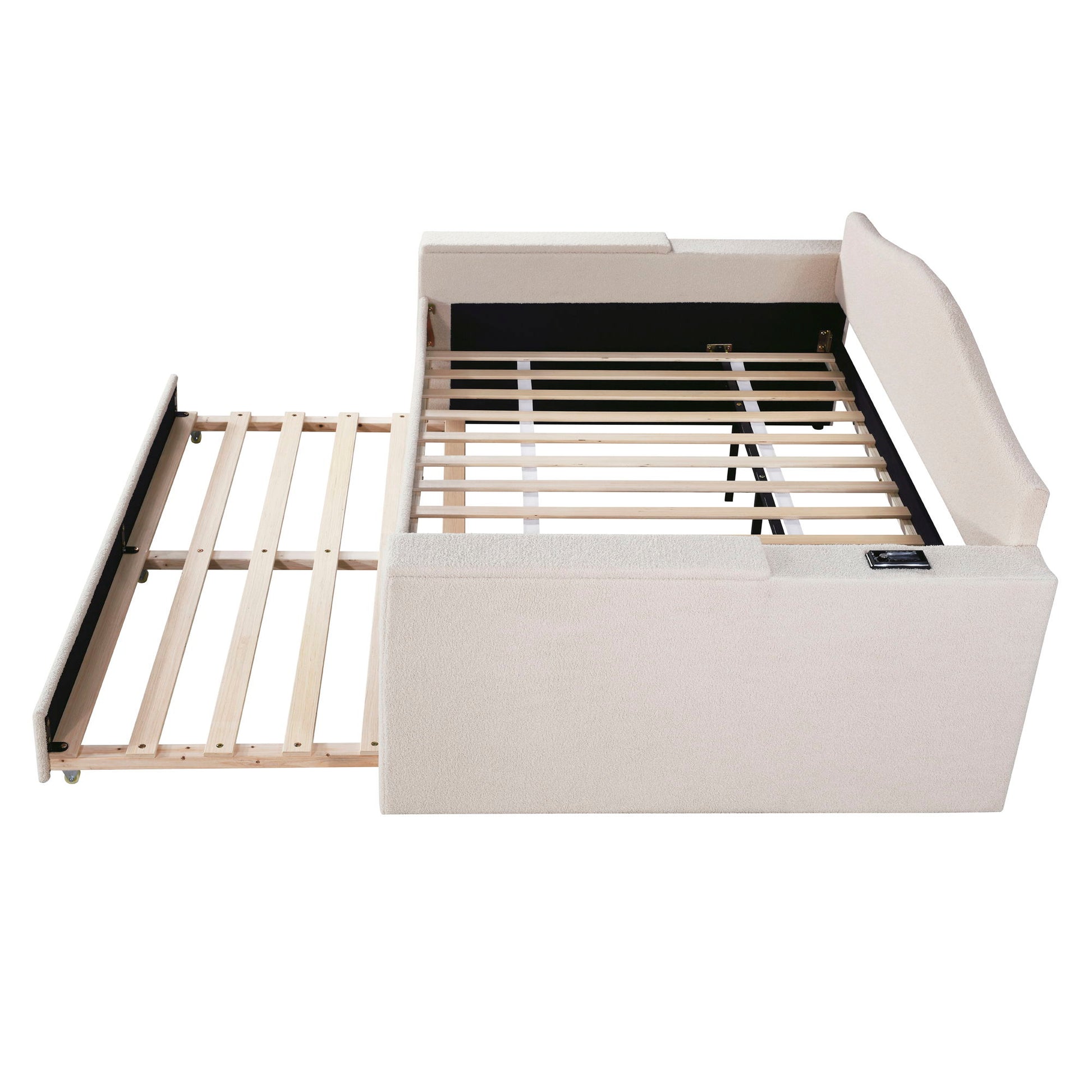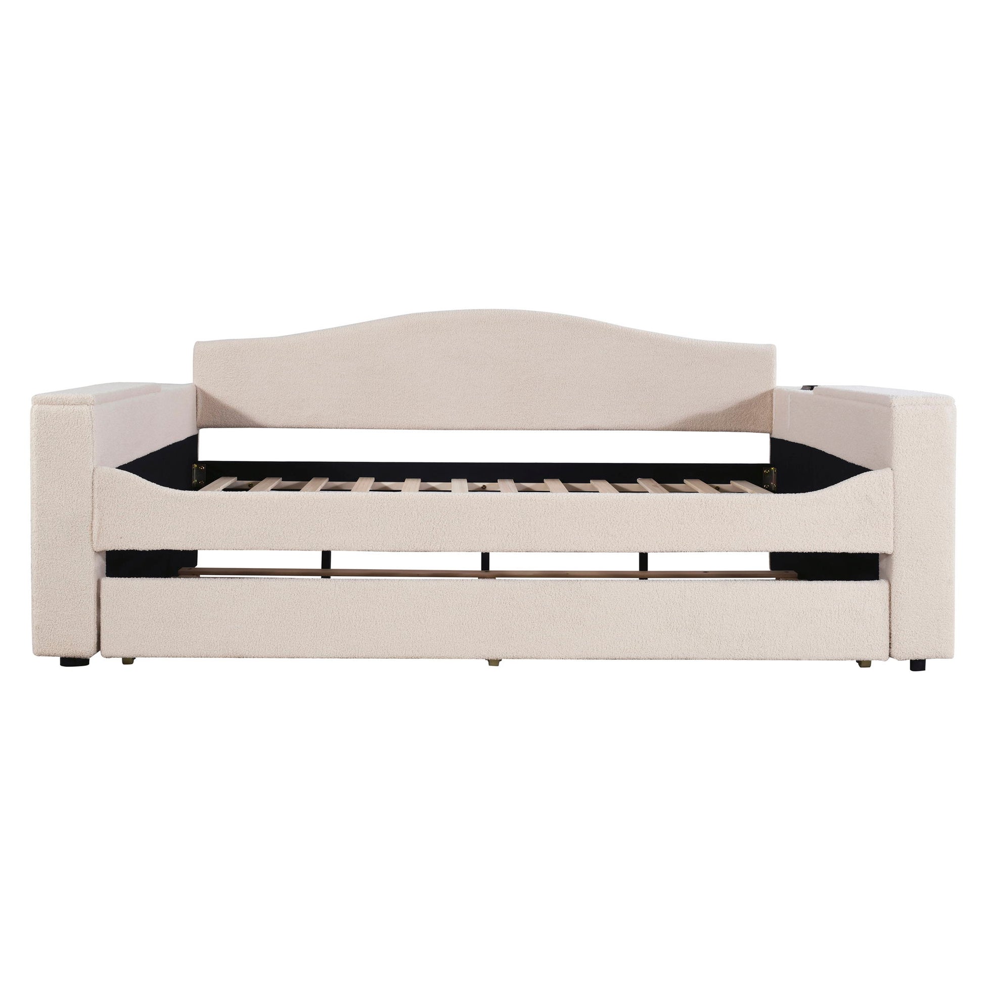 Full Size Upholstered Daybed With Storage Armrests, Trundle And Latest Integrated Bluetooth Audio System, Teddy Fleece - Beige
