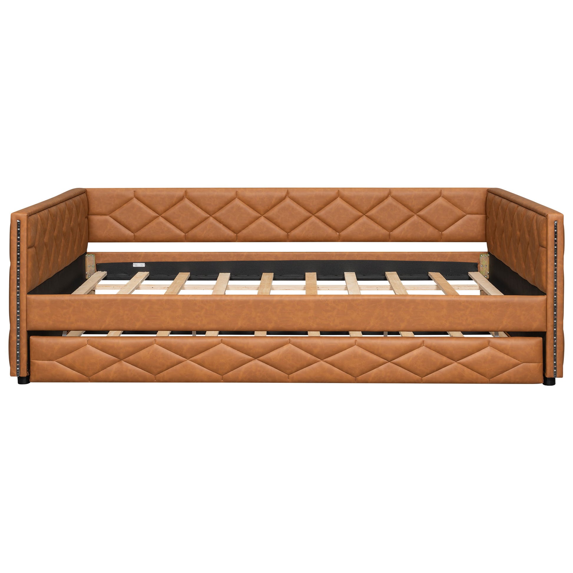 Upholstered Full Long Daybed With Trundle And LED Armrests - Brown