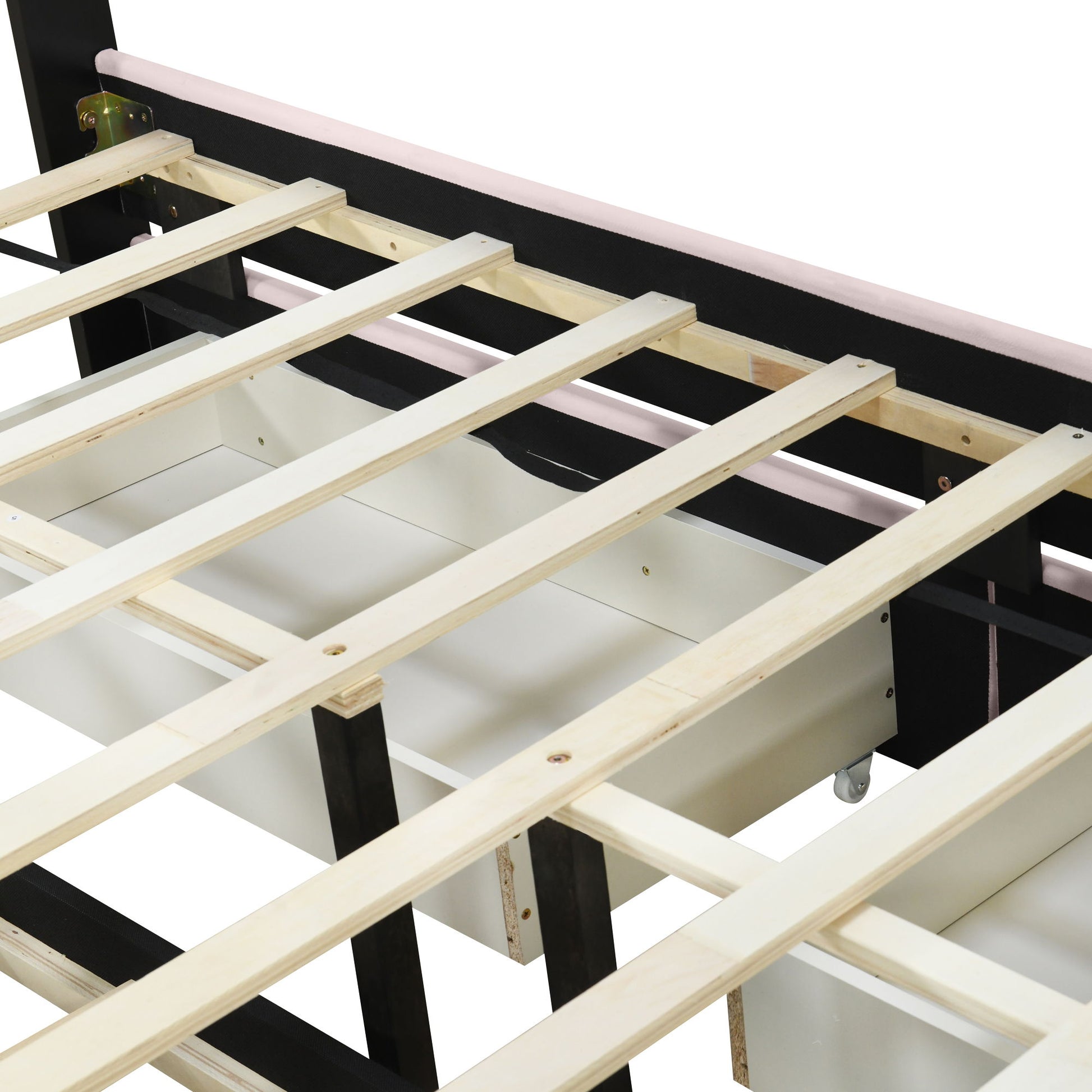 Queen Size Upholstered Platform Bed With 2 Drawers And 1 Trundle, Classic Strip Headboard Design - Pink