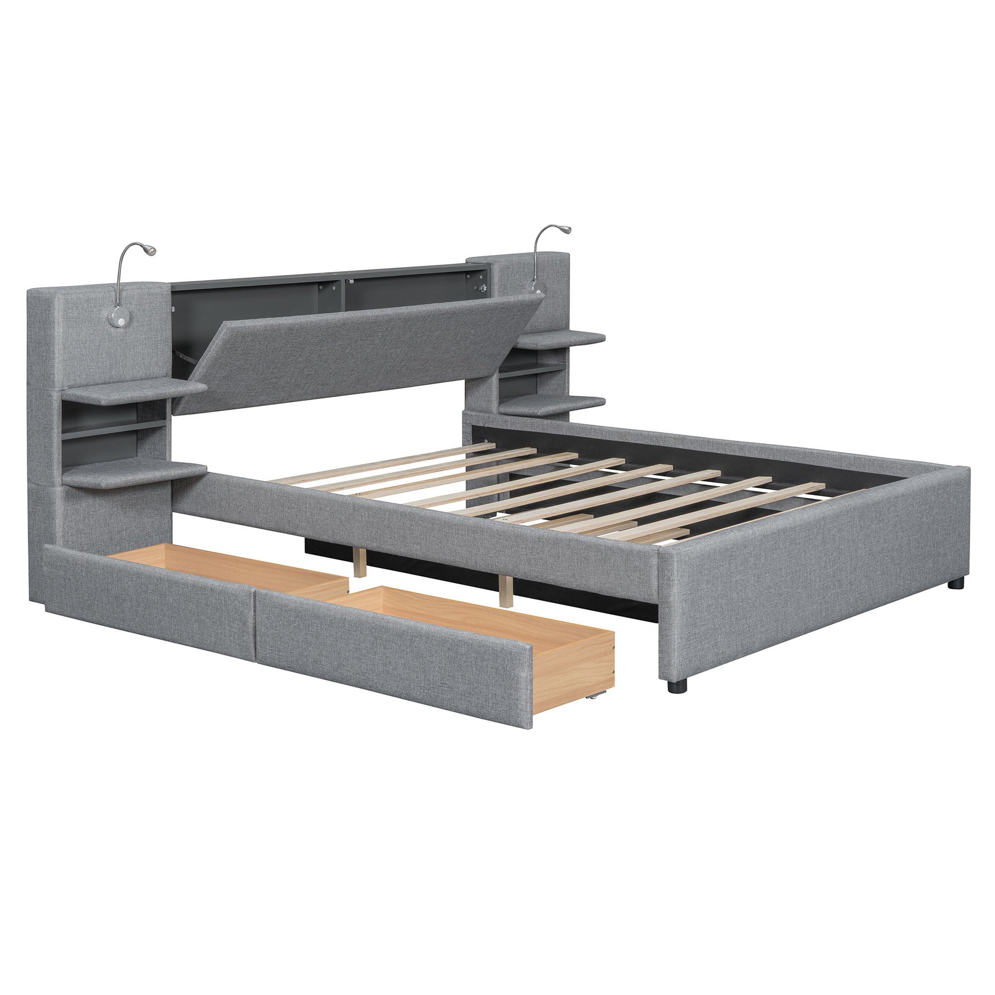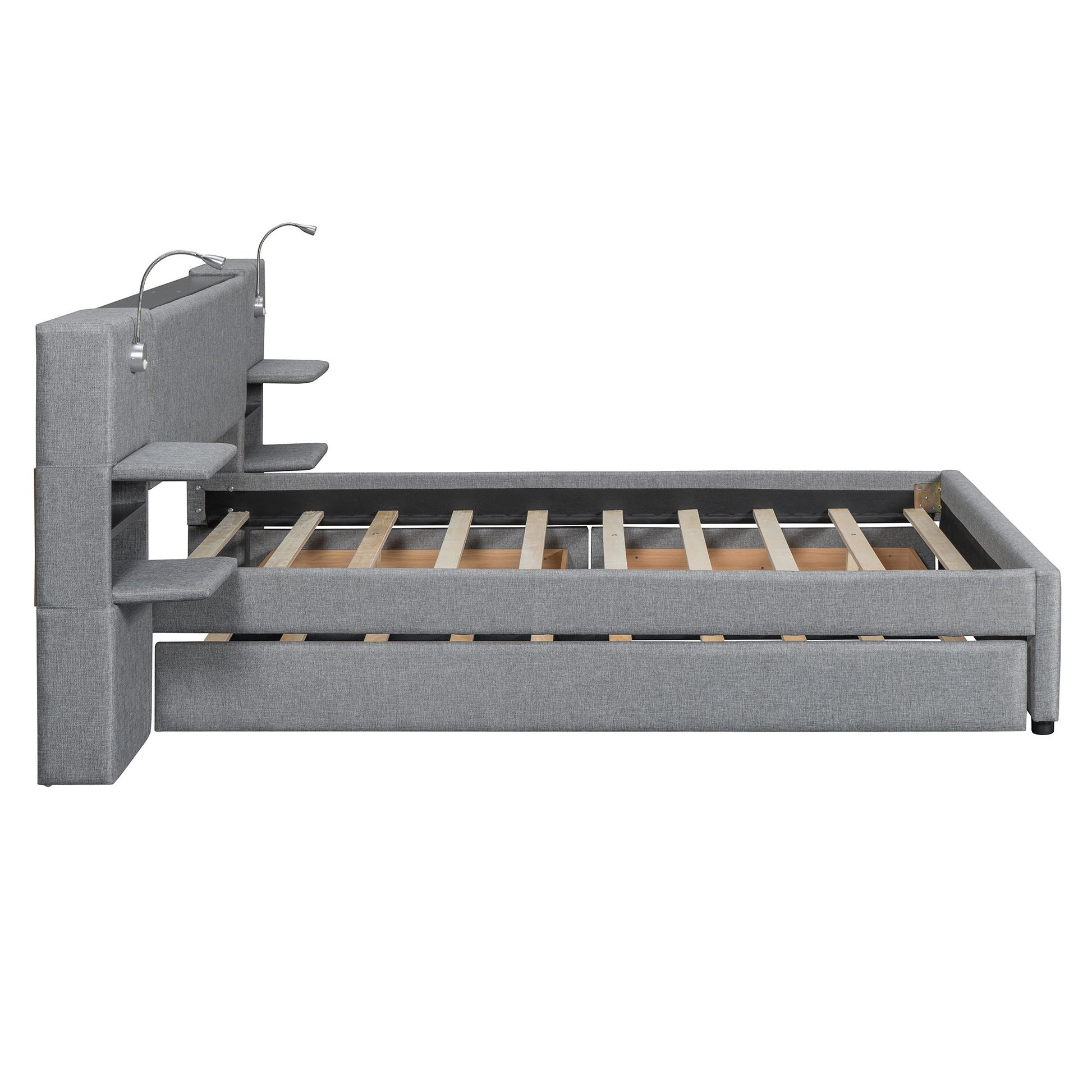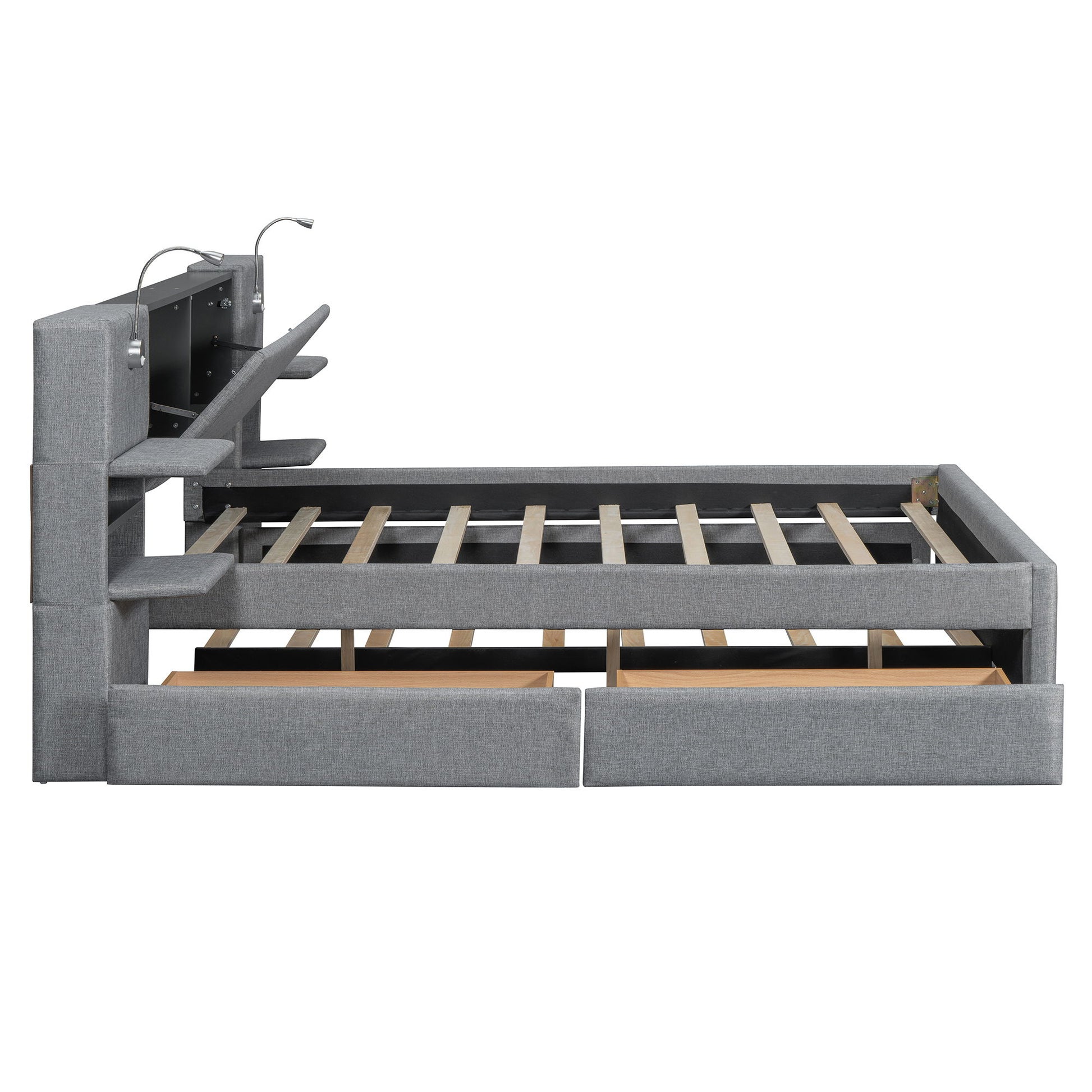 Queen Size Upholstered Platform Bed With Reading Lights, Drawers, Trundle And Shelves - Gray
