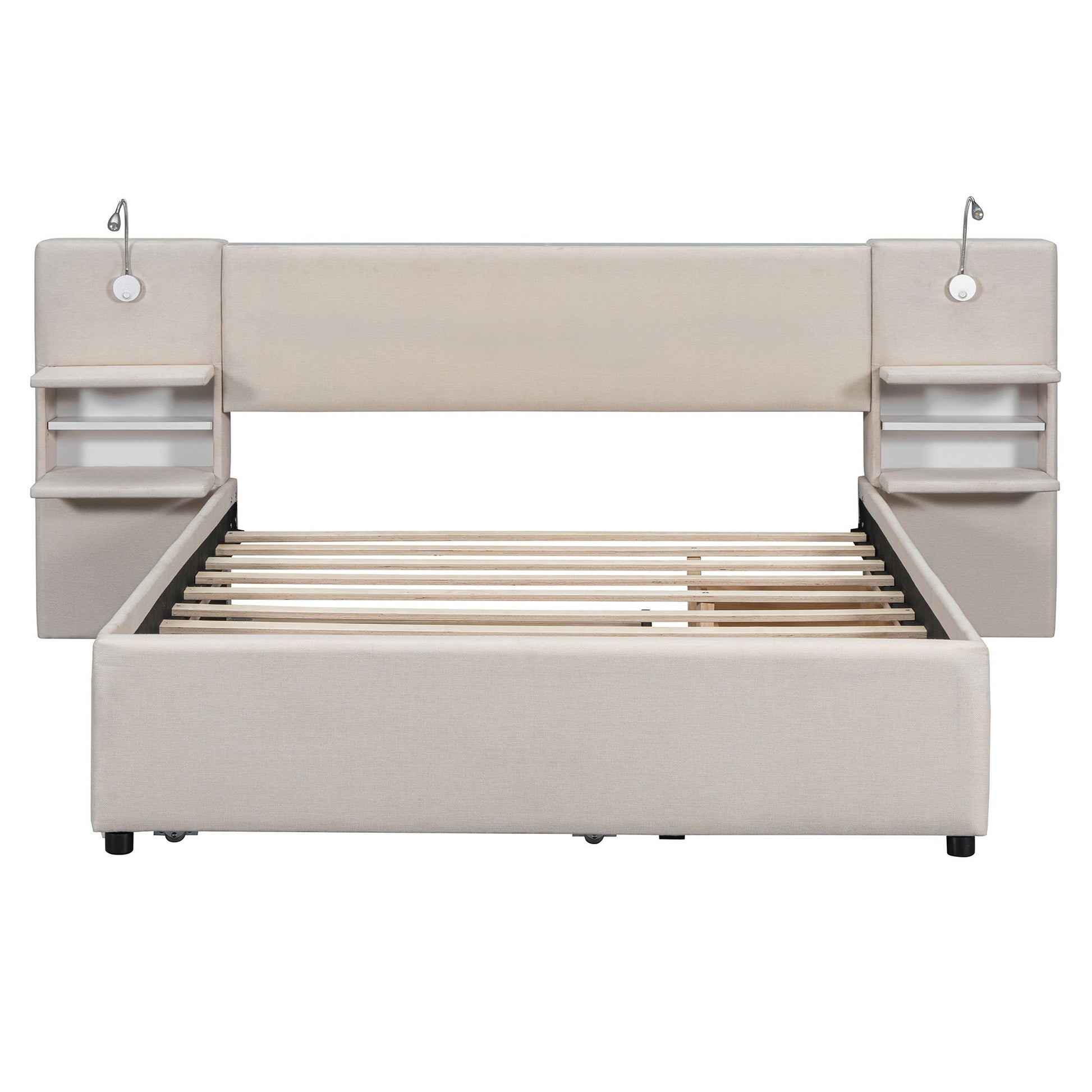 Queen Size Upholstered Platform Bed With Reading Lights, Drawers, Trundle And Shelves - Beige