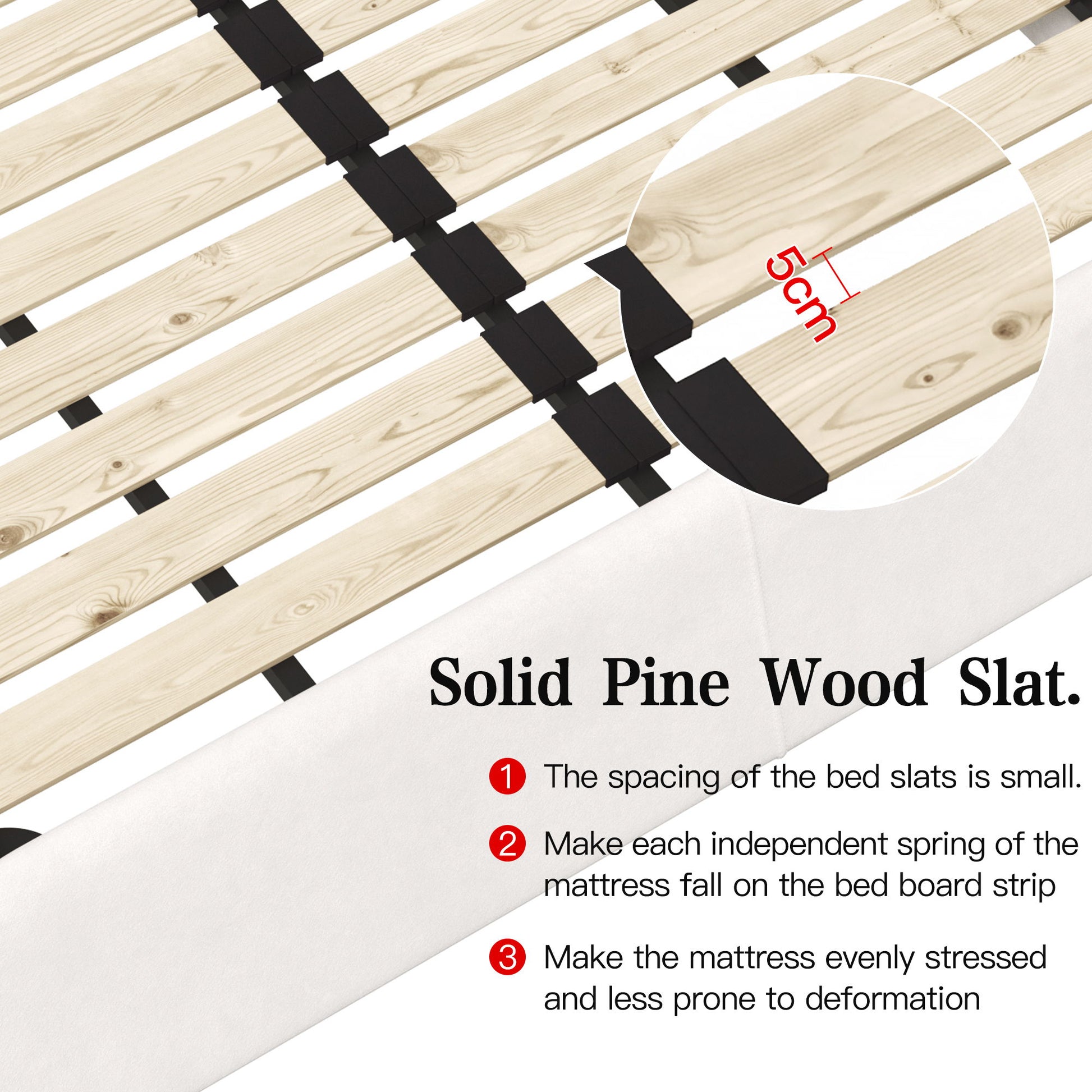- No need for box spring: The distance between the bed plates is very small, only about 5cm, so that each independent spring of the mattress falls on the bed plate strip, making the mattress evenly stressed and not easy to deform.