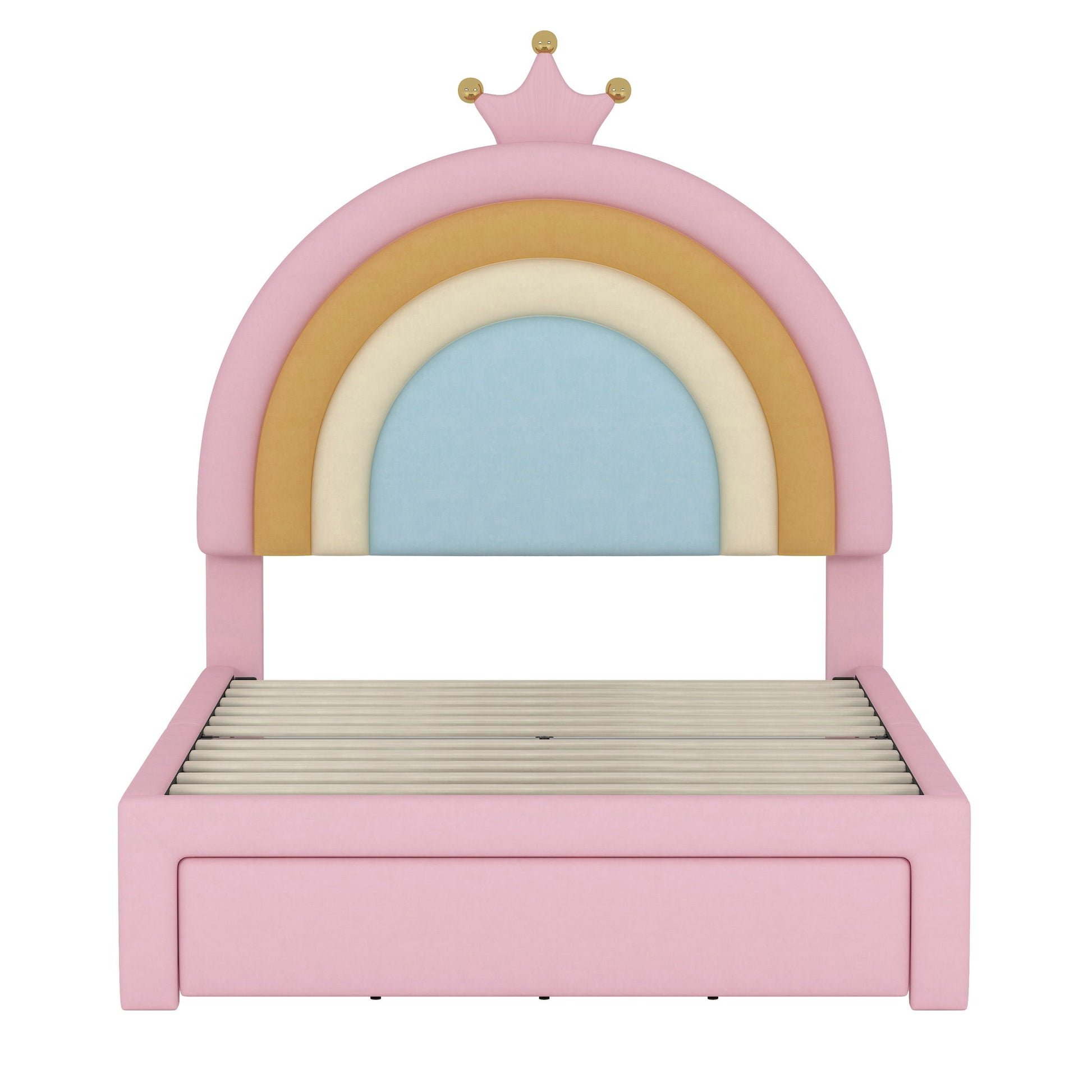 Twin Size Upholstered Rainbow Design Bed, Velvet Princess Platform Bed With Storage Drawer, No Box - Spring Needed - Colorful / Pink