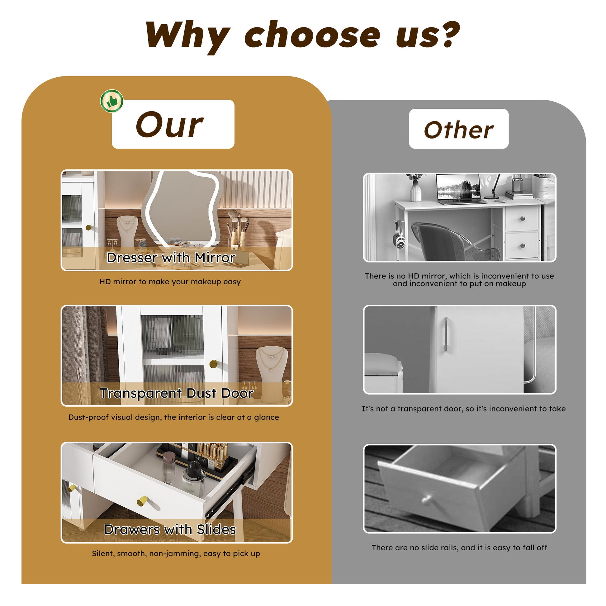 - Ample Storage: Includes 3 drawers, 2 open shelves, and 4 hidden cabinets for organizing cosmetics and accessories.
