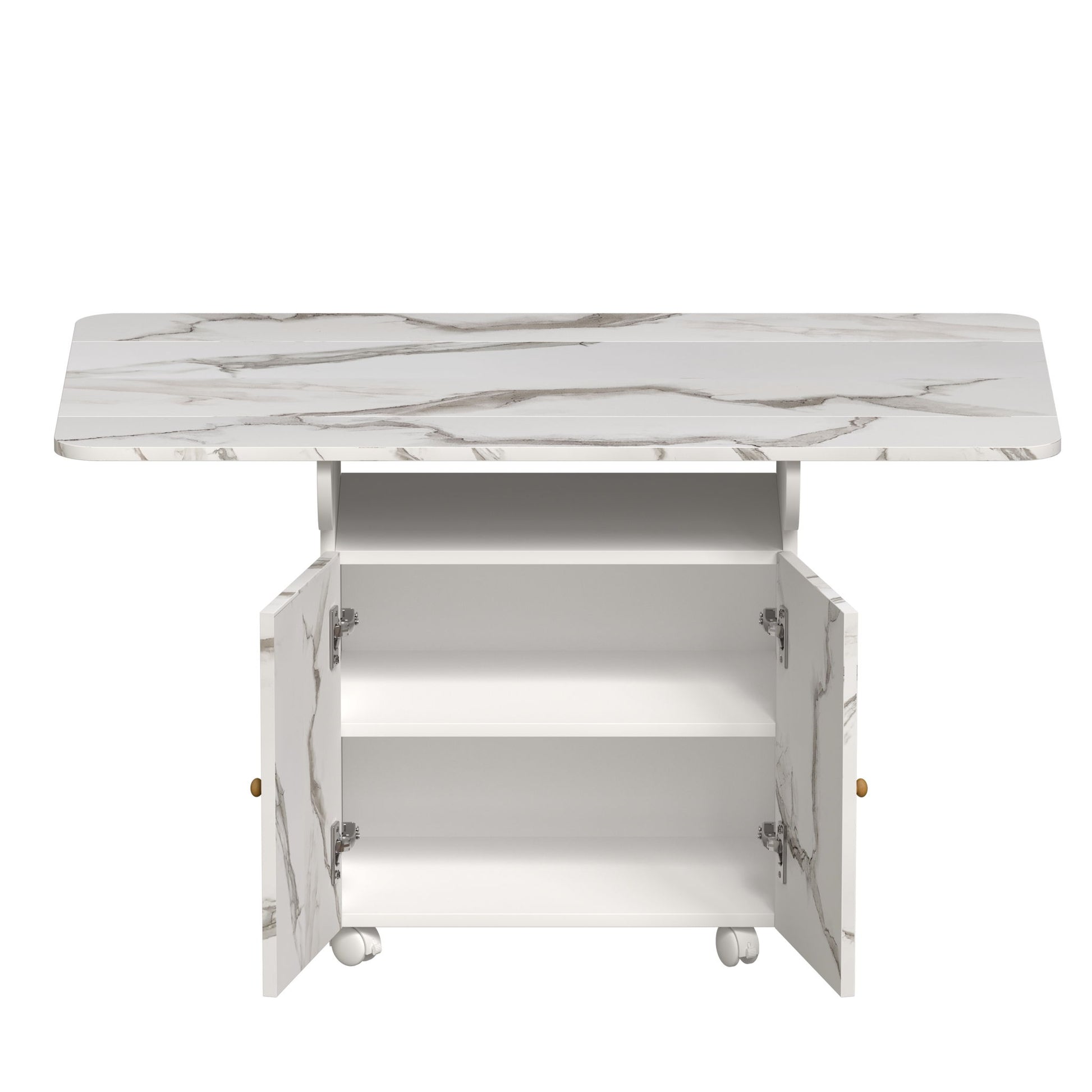 Versatile Marble Folding Dining Table With Storage Rack And Cabinet, 6 Wheels - White
