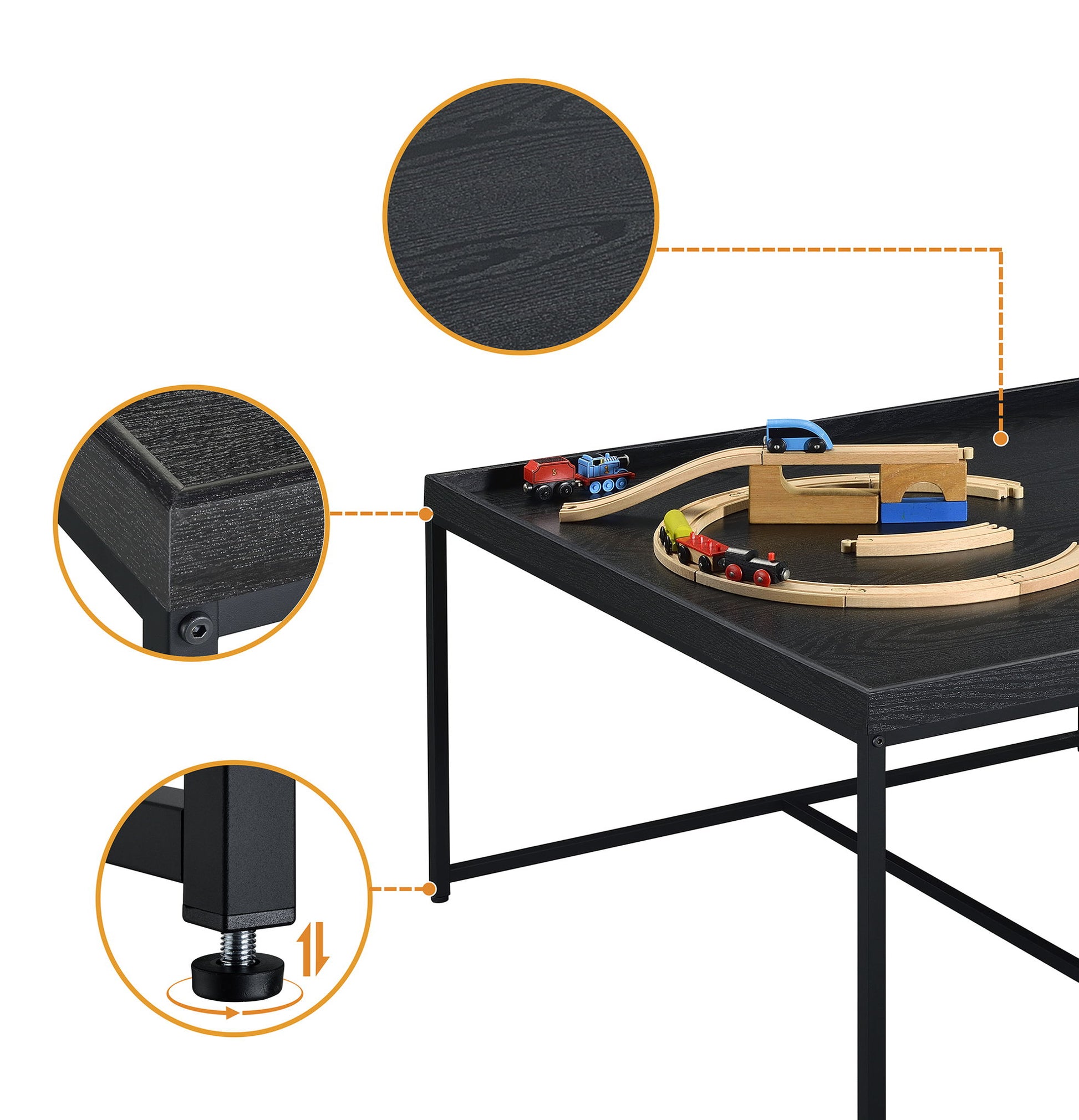 - Looking to style your living room all the while keeping it tidy? The Vinny collection is just the set for you! The Vinny collection manages to be stylish and compact. Featuring a stunning wooden tabletop with raised edges and black metal frame, this coffee table is sure to become the envy of your peers. The raised edges are perfect for keeping items on the table and making your possessions slide or rolling off a thing of the past. Keeping your living space clear of clutter has never been easier with the included storage stools. Invite your friends and family for a cup of coffee and enjoy chatting or use this table as the perfect board game table. The possibilities are endless when you go with the Vinny Collection.