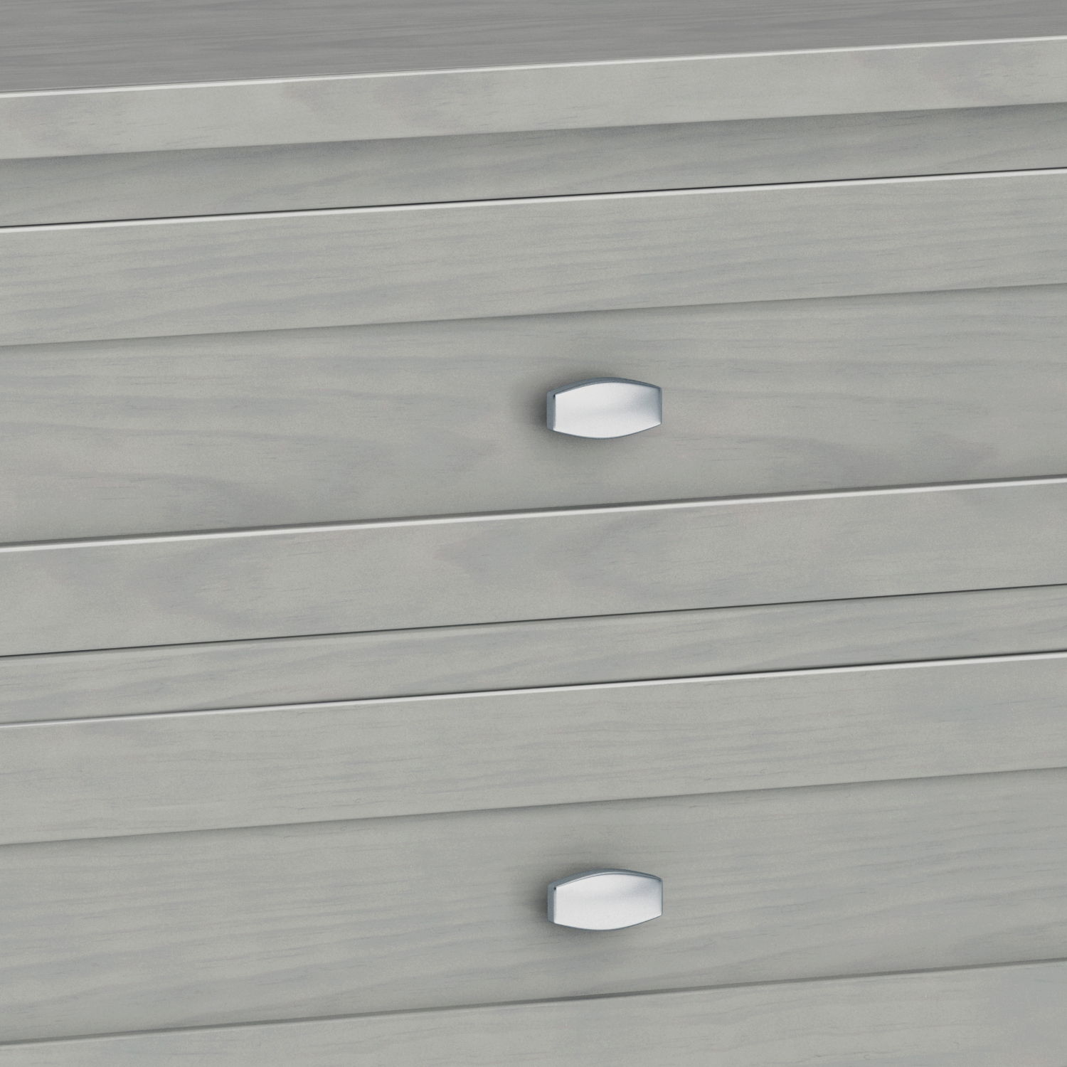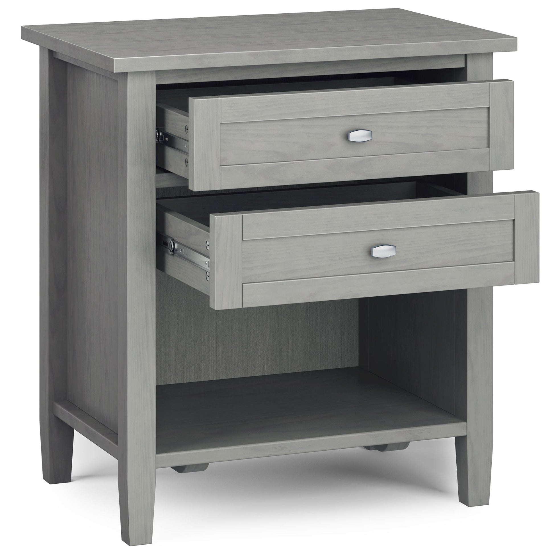 - Features two (2) spacious drawers, open bottom storage area, brushed nickel drawer pulls and metal drawer glides