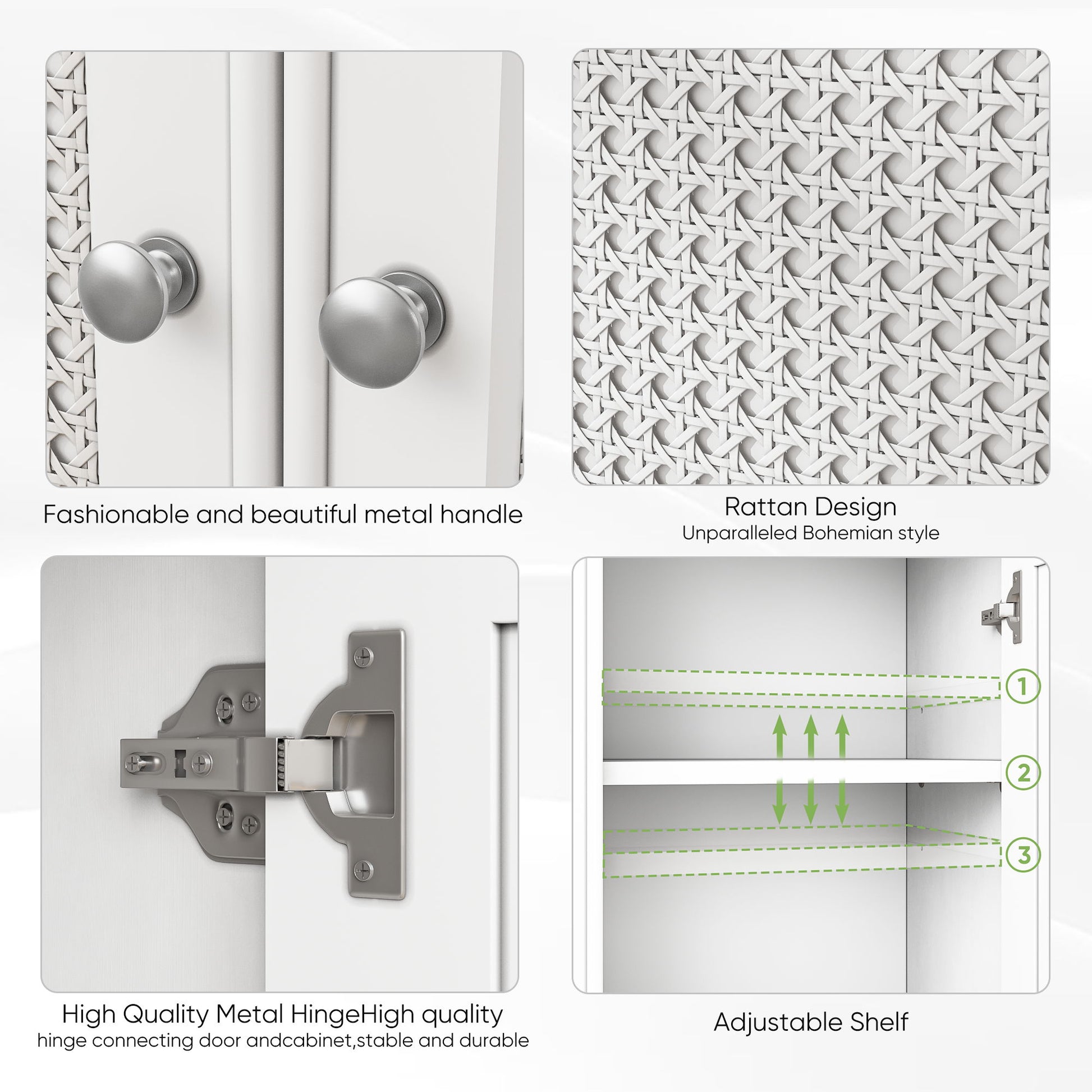 White 2 Door Rattan Storage Cabinet With Adjustable Partition, Medieval Modern Independent Buffet Cabinet, Multifunctional Decorative Cabinet Suitable For Living Room, Kitchen, Bathroom - White